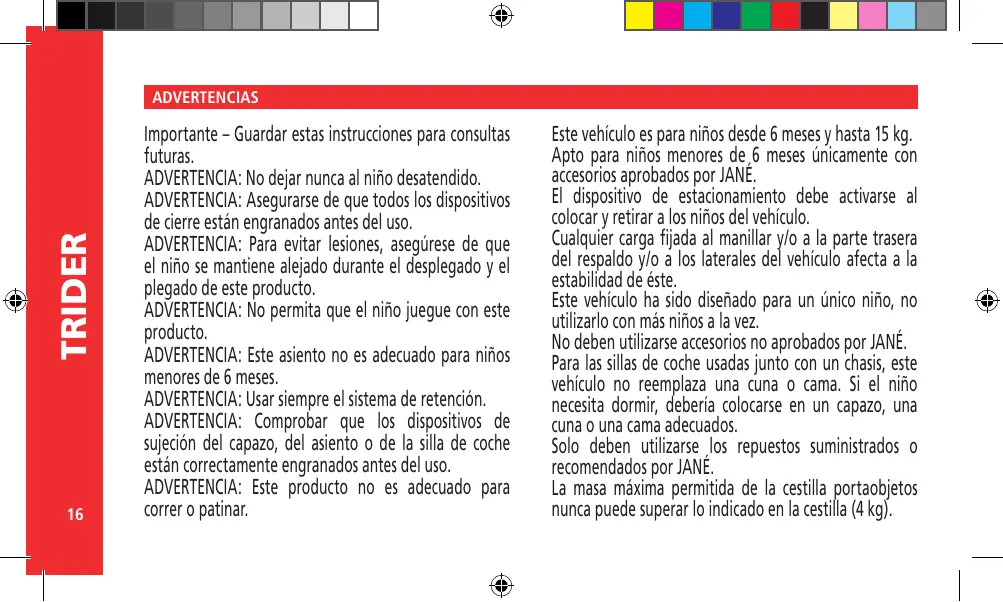 Apto para niños menores de 6 meses únicamente con accesorios aprobados por JANÉ. El dispositivo de estacionamiento debe activarse al colocar y retirar a los niños del vehículo. Cualquier carga fijada al manillar y/o a la parte trasera del respaldo y/o a los laterales del vehículo afecta a la estabilidad de éste. Este vehículo ha sido diseñado para un único niño, no utilizarlo con más niños a la vez. No deben utilizarse accesorios no aprobados por JANÉ. Para las sillas de coche usadas junto con un chasis, este vehículo no reemplaza una cuna o cama. Si el niño necesita dormir, debería colocarse en un capazo, una cuna o una cama adecuados. Solo deben utilizarse los repuestos suministrados o recomendados por JANÉ. La masa máxima permitida de la cestilla portaobjetos nunca puede superar lo indicado en la cestilla (4 kg).