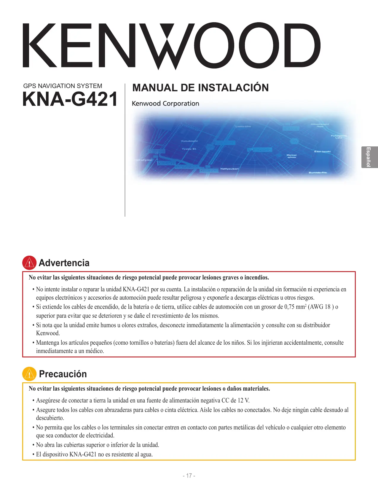 No evitar las siguientes situaciones de riesgo potencial puede provocar lesiones graves o incendios. • No intente instalar o reparar la unidad KNA-G421 por su cuenta. La instalación o reparación de la unidad sin formación ni experiencia en equipos electrónicos y accesorios de automoción puede resultar peligrosa y exponerle a descargas eléctricas u otros riesgos. • Si extiende los cables de encendido, de la batería o de tierra, utilice cables de automoción con un grosor de 0,75 mm2 (AWG 18 ) o superior para evitar que se deterioren y se dañe el revestimiento de los mismos. • Si nota que la unidad emite humos u olores extraños, desconecte inmediatamente la alimentación y consulte con su distribuidor Kenwood. • Mantenga los artículos pequeños (como tornillos o baterías) fuera del alcance de los niños. Si los injirieran accidentalmente, consulte inmediatamente a un médico.