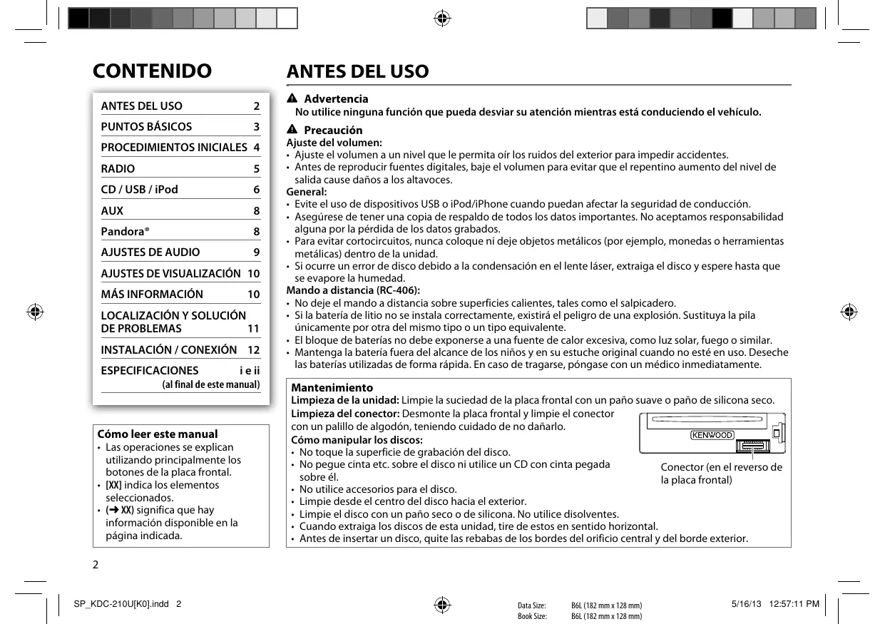 - Pulse y mantenga pulsado para desplazar la información en pantalla. ( no disponible ) ESPAÑOL | SP_KDC-210U[K0].indd 3 Data Size: Book Size: B6L (182 mm x 128 mm) B6L (182 mm x 128 mm)
