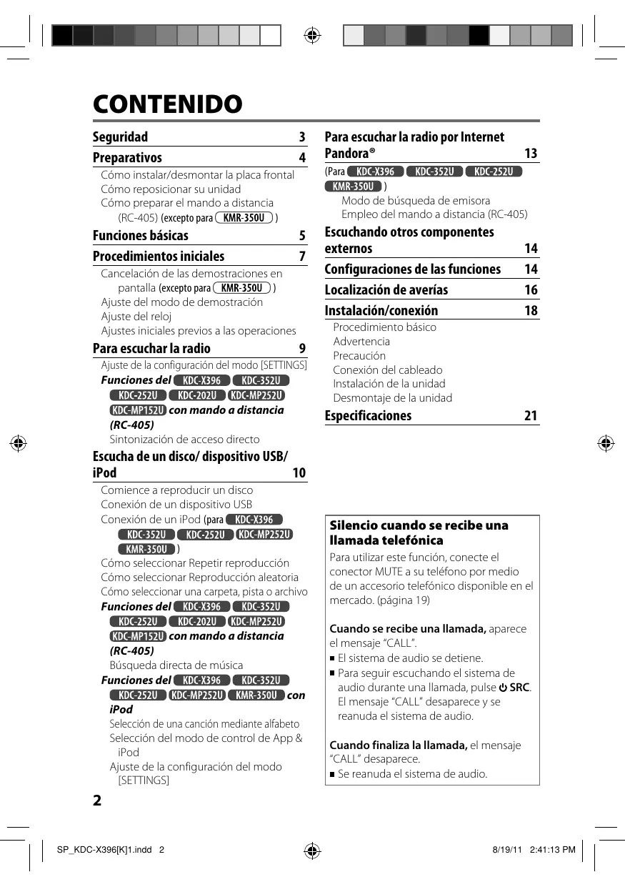 SP_KDC-X396[K]1.indd 2 8/19/11 2:41:13 PM ADVERTENCIA Detenga el automóvil antes de operar la unidad. Información importante… Para evitar cortocircuitos, nunca coloque ni deje objetos metálicos (por ejemplo, monedas o herramientas metálicas) dentro de la unidad. Precaución: Ajuste el volumen de forma tal que pueda escuchar los sonidos exteriores. Si conduce con el volumen demasiado alto podría provocar un accidente. Condensación: Cuando funciona el acondicionador de aire del automóvil puede acumularse humedad en la lente del láser. Esto puede provocar errores en la lectura de los discos. En tal caso, retire el disco y espere hasta que se evapore la humedad. Esta unidad sólo puede reproducir los CD con: Se requiere un cable de conexión USB, CA-U1EX (máx.: 500 mA) (accesorio opcional) para conectar un dispositivo USB. Puede conectar un Apple iPod/iPhone con La palabra “iPod” que se utiliza en este manual hace referencia a un iPod o iPhone conectado a esta unidad mediante el cable de conexión KCA-iP102 (accesorio opcional). Si tiene problemas durante la instalación, consulte con su distribuidor Kenwood. Cuando compre componentes externos, verifique antes con su distribuidor Kenwood que dichos accesorios funcionen con su modelo y en su área. En un manual en línea en el siguiente sitio, encontrará información detallada y notas acerca de los archivos de audio que pueden reproducirse: www.kenwood.com/cs/ce/audiofile/ ESPAÑOL Seguridad Las ilustraciones del presente manual son ejemplos utilizados para explicar más claramente cómo se utilizan los controles. Por lo tanto, las imágenes de las ilustraciones pueden diferir de las que aparecen en el equipo real. Mantenimiento Limpieza de la unidad: Limpie la suciedad del panel con un paño seco o de silicona. Si no observa esta precaución podría dañar el monitor o la unidad. Limpieza del conector: La unidad no podrá funcionar correctamente si hay suciedad en los conectores situados entre la unidad y la placa frontal. Desmonte la placa frontal y limpie el conector con un palillo de algodón, teniendo cuidado de no dañarlo. Conector (en el reverso de la placa frontal) Cómo manipular los discos No toque la superficie de grabación del disco. No pegue cinta etc. sobre el disco ni utilice un CD con cinta pegada sobre él. No utilice accesorios para el disco. Limpie desde el centro del disco hacia el exterior. Limpie el disco con un paño seco o de silicona. No utilice disolventes. Cuando extraiga los discos de esta unidad, tire de estos en sentido horizontal. Antes de insertar un disco, quite las rebabas de los bordes del orificio central y del borde exterior.