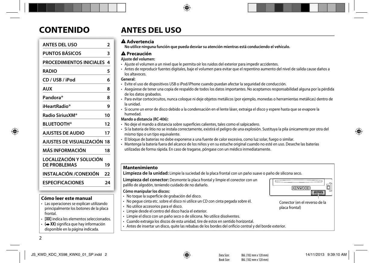 64 dB Separación estéreo (1 kHz) 40 dB Versión Certificado para Bluetooth Ver.2.1+EDR 530 kHz — 1 700 kHz (espacio 10 kHz) Gama de frecuencias 2,402 GHz — 2,480 GHz 29 dBμ (28,2 μV) Potencia de salida Clase de potencia 2 +4 dBm (MÁX), 0 dBm (AVE) Alcance máximo de comunicación En línea recta, aproximadamente 10 m (32,8 pies) Perfil HFP (Perfil manos libres) SPP (Perfil del puerto en serie) PBAP (Perfil de acceso a la guía telefónica) OPP (Perfil de carga de objetos) A2DP (Perfil Avanzado de Distribución de Audio) AVRCP (Perfil de Control Remoto de Audio/Video) Potencia de salida máxima Potencia en todo el ancho de banda Impedancia del altavoz Acción tonal 50 W × 4 22 W × 4 (a menos del 1 % THD) 4Ω—8Ω Graves 200 Hz ±8 dB Registro medio 2,5 kHz ±8 dB Agudos 12,5 kHz ±8 dB KDC-X598 : 4 000 mV/10 kΩ Otros modelos: 2 500 mV/10 kΩ ≤ 600 Ω Sensibilidad útil (Relación señal/ ruido = 20 dB) Diodo láser GaAIAs Velocidad de giro 500 rpm — 200 rpm (CLV) Fluctuación y trémolo Por debajo del límite medible Respuesta de frecuencia (±1 dB) 20 Hz — 20 kHz Distorsión armónica total (1 kHz) 0,01 % Relación señal a ruido (1 kHz) KDC-X598 : 110 dB Otros modelos: 105 dB Gama dinámica 90 dB Separación de canales 85 dB MP3 decodificado Compatible con MPEG-1/2 Audio Layer-3 WMA decodificado Compatible con Windows Media Audio Bluetooth Relación señal a ruido (MONO) AM Gama de frecuencias Reproductor de CD USB 87,9 MHz — 107,9 MHz (espacio 200 kHz) Sensibilidad útil (Relación señal/ ruido = 26 dB) Audio SINTONIZADOR FM Gama de frecuencias Nivel de salida de preamplificador/ carga (CD) Impedancia de salida de preamplificador ESPECIFICACIONES Respuesta de frecuencia (±3 dB) 20 Hz — 20 kHz Voltaje de entrada máximo 1 200 mV Impedancia de entrada 30 kΩ Voltaje de trabajo Consumo de corriente máxima 10 A Gama de temperaturas de funcionamiento 0°C — +40°C Tamaño de instalación (An × Al × F) Sujeto a cambios sin previo aviso.
