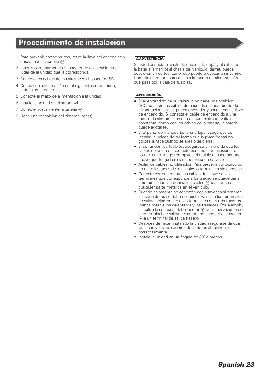 - Instale la unidad en un ángulo de 30˚ o menos. Spanish 23 Conexiòn 2ADVERTENCIA Si usted conecta el cable de encendido (rojo) y el cable de la batería (amarillo) al chasis del vehículo (tierra), puede ocasionar un cortocircuito, que puede provocar un incendio. Conecte siempre esos cables a la fuente de alimentación que pasa por la caja de fusibles. Unidad monitor No conectar. Conecte al cableado del interruptor de detección del freno de parqueo del vehículo utilizando el conector relé suministrado. 2 PRECAUCIÓN Por razones de seguridad, asegúrese de conectar el cable del sensor del freno de mano. PRK SW Spanish