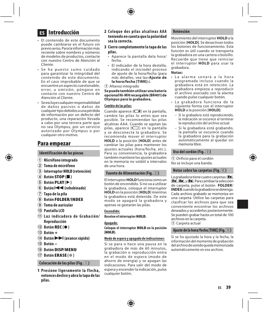 - El indicador de la hora destella, indicando el iniciodel proceso de ajuste de la hora/fecha (para más detalles, vea las«Ajuste de la hora/fecha [TIME]»). 1 Altavoz integrado Se puede también utilizar una batería opcional Ni-MH recargable (BR401) de Olympus para la grabadora. Cambio de las pilas: Cuando aparece [N] en la pantalla, cambie las pilas lo antes que sea posible. Se recomiendan las pilas alcalinas AAA. Cuando se agotan las pilas, aparece [O] en la pantalla y se desconecta la grabadora. Se recomienda mover el interruptor HOLD a la posición [HOLD] antes de cambiar las pilas para mantener los ajustes actuales (hora/fecha, etc.). Para su conveniencia, la grabadora también mantiene los ajustes actuales en la memoria no volátil a intervalos de una hora. Fuente de Alimentación (Fig. 2) El interruptor HOLD funciona como un botón de encendido. Si no va a utilizar la grabadora, coloque el interruptor HOLD en la posición [HOLD] mientras la grabadora está detenida. De este modo se apagará la grabadora y apenas se gastarán las pilas. Encendido: Resetee el interruptor HOLD. Apagado: Coloque el interruptor HOLD en la posición [HOLD]. Modo de espera y apagado de indicaciones: Si se para o hace una pausa en la grabadora de más de 60 minutos, la grabación o reproducción entra en el modo de espera (modo de ahorro de energía) y se apagan las indicaciones. Para salir del modo de espera y encender la indicación, pulse cualquier botón. Retención Movimiento del interruptor HOLD a la posición [HOLD]. Se desactivan todos los botones de funcionamiento. Esta función es útil cuando se transporta la grabadora en una cartera o bolsillo. Recuerde que tiene que reiniciar el interruptor HOLD para usar la grabadora. Notas: