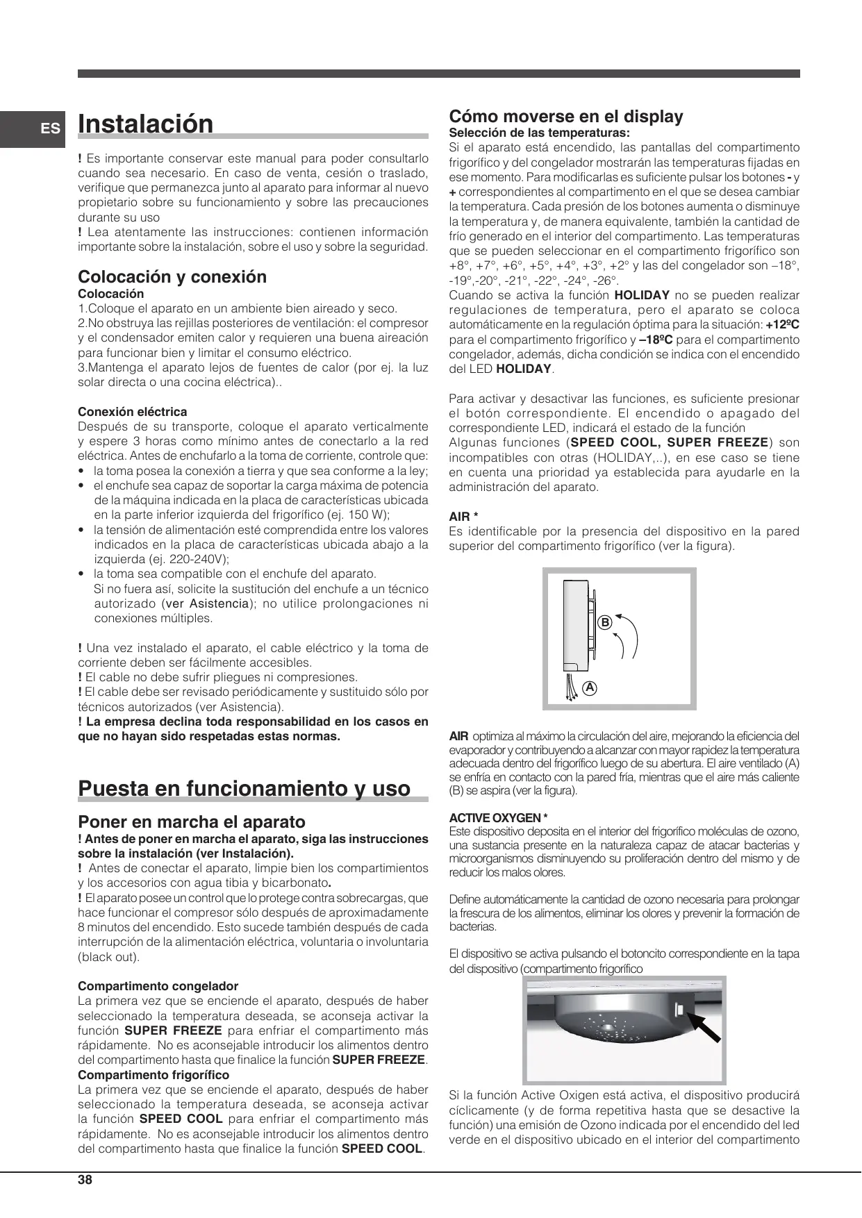 (B) se aspira (ver la figura). ACTIVE OXYGEN * Este dispositivo deposita en el interior del frigorífico moléculas de ozono, una sustancia presente en la naturaleza capaz de atacar bacterias y microorganismos disminuyendo su proliferación dentro del mismo y de reducir los malos olores. Define automáticamente la cantidad de ozono necesaria para prolongar la frescura de los alimentos, eliminar los olores y prevenir la formación de bacterias. El dispositivo se activa pulsando el botoncito correspondiente en la tapa del dispositivo (compartimento frigorífico