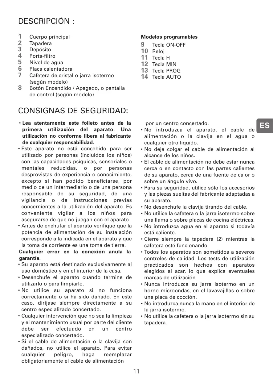 por un centro concertado. • No introduzca el aparato, el cable de alimentación o la clavija en el agua o cualquier otro líquido. • No deje colgar el cable de alimentación al alcance de los niños. • El cable de alimentación no debe estar nunca cerca o en contacto con las partes calientes de su aparato, cerca de una fuente de calor o sobre un ángulo vivo. • Para su seguridad, utilice sólo los accesorios y las piezas sueltas del fabricante adaptadas a su aparato. • No desenchufe la clavija tirando del cable. • No utilice la cafetera o la jarra isotermo sobre una llama o sobre placas de cocina eléctricas. • No introduzca agua en el aparato si todavía está caliente. • Cierre siempre la tapadera (2) mientras la cafetera esté funcionando. • Todos los aparatos son sometidos a severos controles de calidad. Los tests de utilización practicados son hechos con aparatos elegidos al azar, lo que explica eventuales marcas de utilización. • Nunca introduzca su jarra isotermo en un horno microondas, en el lavavajillas o sobre una placa de cocción. • No introduzca nunca la mano en el interior de la jarra isotermo. • No utilice la cafetera o la jarra isotermo sin su tapadera.