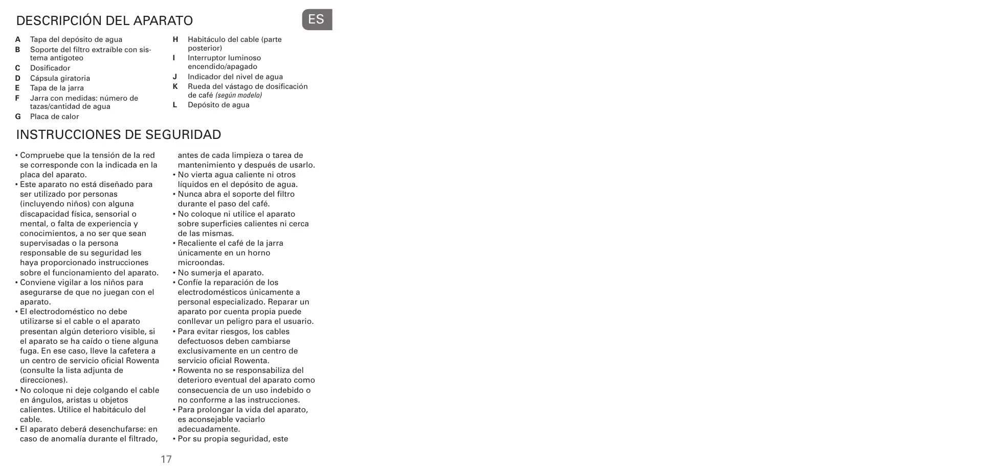 INSTRUCCIONES DE SEGURIDAD antes de cada limpieza o tarea de mantenimiento y después de usarlo. • No vierta agua caliente ni otros líquidos en el depósito de agua. • Nunca abra el soporte del filtro durante el paso del café. • No coloque ni utilice el aparato sobre superficies calientes ni cerca de las mismas. • Recaliente el café de la jarra únicamente en un horno microondas. • No sumerja el aparato. • Confíe la reparación de los electrodomésticos únicamente a personal especializado. Reparar un aparato por cuenta propia puede conllevar un peligro para el usuario. • Para evitar riesgos, los cables defectuosos deben cambiarse exclusivamente en un centro de servicio oficial Rowenta. • Rowenta no se responsabiliza del deterioro eventual del aparato como consecuencia de un uso indebido o no conforme a las instrucciones. • Para prolongar la vida del aparato, es aconsejable vaciarlo adecuadamente. • Por su propia seguridad, este