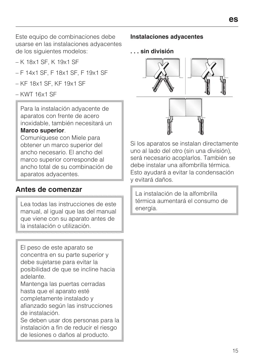 Este equipo de combinaciones debe usarse en las instalaciones adyacentes de los siguientes modelos: Instalaciones adyacentes . . . sin división – K 18x1 SF, K 19x1 SF – F 14x1 SF, F 18x1 SF, F 19x1 SF – KF 18x1 SF, KF 19x1 SF – KWT 16x1 SF Para la instalación adyacente de aparatos con frente de acero inoxidable, también necesitará un Marco superior. Comuníquese con Miele para obtener un marco superior del ancho necesario. El ancho del marco superior corresponde al ancho total de su combinación de aparatos adyacentes. Antes de comenzar Lea todas las instrucciones de este manual, al igual que las del manual que viene con su aparato antes de la instalación o utilización. Si los aparatos se instalan directamente uno al lado del otro (sin una división), será necesario acoplarlos. También se debe instalar una alfombrilla térmica. Esto ayudará a evitar la condensación y evitará daños. La instalación de la alfombrilla térmica aumentará el consumo de energía. El peso de este aparato se concentra en su parte superior y debe sujetarse para evitar la posibilidad de que se incline hacia adelante. Mantenga las puertas cerradas hasta que el aparato esté completamente instalado y afianzado según las instrucciones de instalación. Se deben usar dos personas para la instalación a fin de reducir el riesgo de lesiones o daños al producto.