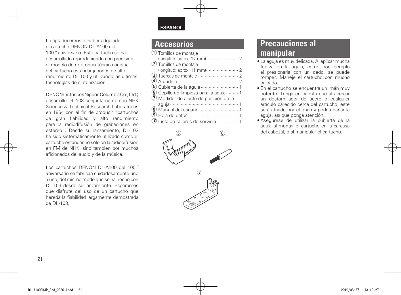 Le agradecemos el haber adquirido el cartucho DENON DL-A100 del 100.º aniversario. Este cartucho se ha desarrollado reproduciendo con precisión el modelo de referencia técnico original del cartucho estándar japonés de alto rendimiento DL-103 y utilizando las últimas tecnologías de sintonización. DENON (entonces Nippon Columbia Co., Ltd.) desarrolló DL-103 conjuntamente con NHK Science & Technical Research Laboratories en 1964 con el fin de producir “cartuchos de gran fiabilidad y alto rendimiento para la radiodifusión de grabaciones en estéreo”. Desde su lanzamiento, DL-103 ha sido sistemáticamente utilizado como el cartucho estándar no sólo en la radiodifusión en FM de NHK, sino también por muchos aficionados del audio y de la música. Los cartuchos DENON DL-A100 del 100.º aniversario se fabrican cuidadosamente uno a uno, del mismo modo que se ha hecho con DL-103 desde su lanzamiento. Esperamos que disfrute del uso de un cartucho que hereda la fiabilidad largamente demostrada de DL-103.