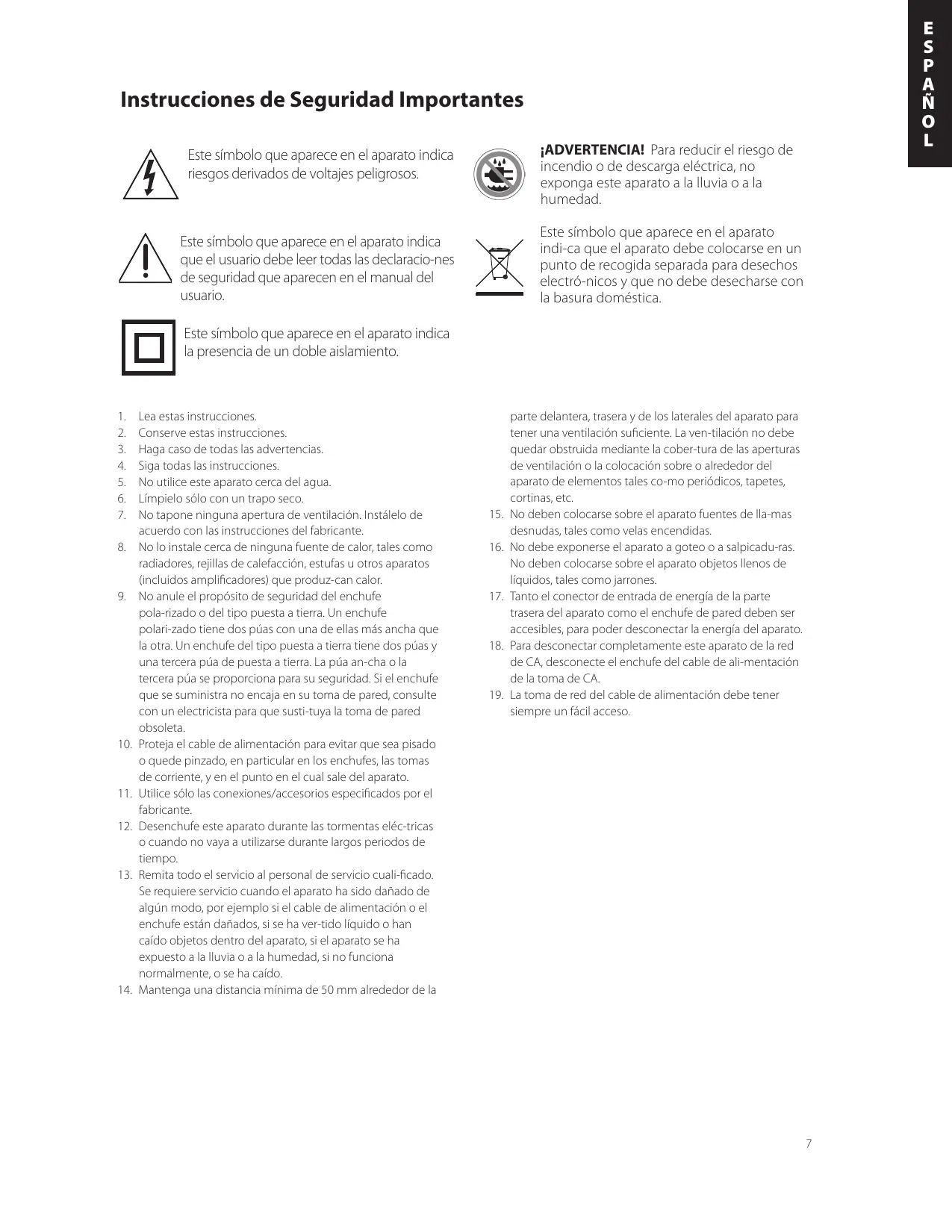 Conserve estas instrucciones. Haga caso de todas las advertencias. Siga todas las instrucciones. No utilice este aparato cerca del agua. Límpielo sólo con un trapo seco. No tapone ninguna apertura de ventilación. Instálelo de acuerdo con las instrucciones del fabricante. No lo instale cerca de ninguna fuente de calor, tales como radiadores, rejillas de calefacción, estufas u otros aparatos (incluidos amplificadores) que produz-can calor. No anule el propósito de seguridad del enchufe pola-rizado o del tipo puesta a tierra. Un enchufe polari-zado tiene dos púas con una de ellas más ancha que la otra. Un enchufe del tipo puesta a tierra tiene dos púas y una tercera púa de puesta a tierra. La púa an-cha o la tercera púa se proporciona para su seguridad. Si el enchufe que se suministra no encaja en su toma de pared, consulte con un electricista para que susti-tuya la toma de pared obsoleta. Proteja el cable de alimentación para evitar que sea pisado o quede pinzado, en particular en los enchufes, las tomas de corriente, y en el punto en el cual sale del aparato. Utilice sólo las conexiones/accesorios especificados por el fabricante. Desenchufe este aparato durante las tormentas eléc-tricas o cuando no vaya a utilizarse durante largos periodos de tiempo. Remita todo el servicio al personal de servicio cuali-ficado. Se requiere servicio cuando el aparato ha sido dañado de algún modo, por ejemplo si el cable de alimentación o el enchufe están dañados, si se ha ver-tido líquido o han caído objetos dentro del aparato, si el aparato se ha expuesto a la lluvia o a la humedad, si no funciona normalmente, o se ha caído. Mantenga una distancia mínima de 50 mm alrededor de la