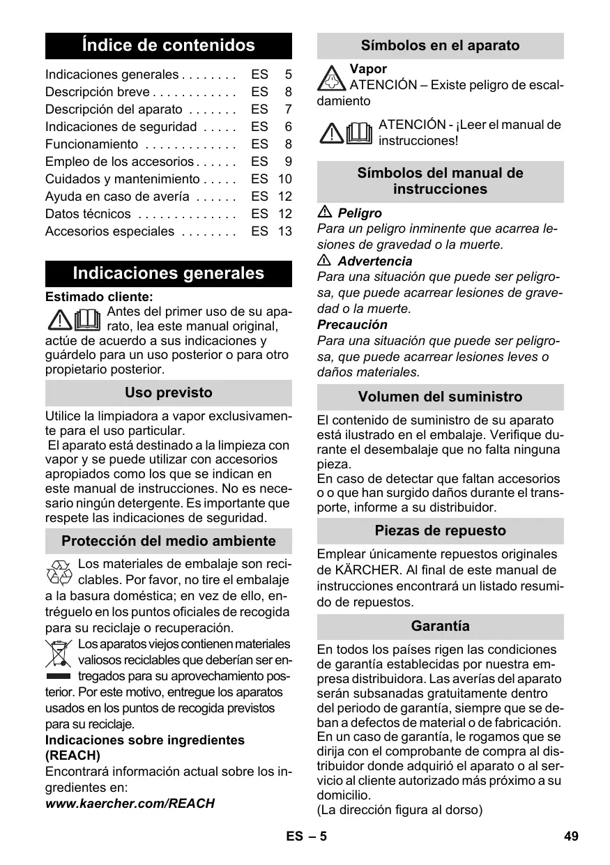 Vapor ATENCIÓN – Existe peligro de escaldamiento ATENCIÓN - ¡Leer el manual de instrucciones! Símbolos del manual de instrucciones Peligro Estimado cliente: Antes del primer uso de su aparato, lea este manual original, actúe de acuerdo a sus indicaciones y guárdelo para un uso posterior o para otro propietario posterior. Para un peligro inminente que acarrea lesiones de gravedad o la muerte. 몇 Advertencia Para una situación que puede ser peligrosa, que puede acarrear lesiones de gravedad o la muerte. Precaución Para una situación que puede ser peligrosa, que puede acarrear lesiones leves o daños materiales. Uso previsto Volumen del suministro Utilice la limpiadora a vapor exclusivamente para el uso particular. El aparato está destinado a la limpieza con vapor y se puede utilizar con accesorios apropiados como los que se indican en este manual de instrucciones. No es necesario ningún detergente. Es importante que respete las indicaciones de seguridad. El contenido de suministro de su aparato está ilustrado en el embalaje. Verifique durante el desembalaje que no falta ninguna pieza. En caso de detectar que faltan accesorios o o que han surgido daños durante el transporte, informe a su distribuidor. Indicaciones generales Protección del medio ambiente Los materiales de embalaje son reciclables. Por favor, no tire el embalaje a la basura doméstica; en vez de ello, entréguelo en los puntos oficiales de recogida para su reciclaje o recuperación. Los aparatos viejos contienen materiales valiosos reciclables que deberían ser entregados para su aprovechamiento posterior. Por este motivo, entregue los aparatos usados en los puntos de recogida previstos para su reciclaje. Indicaciones sobre ingredientes (REACH) Encontrará información actual sobre los ingredientes en: www.kaercher.com/REACH Piezas de repuesto Emplear únicamente repuestos originales de KÄRCHER. Al final de este manual de instrucciones encontrará un listado resumido de repuestos. Garantía En todos los países rigen las condiciones de garantía establecidas por nuestra empresa distribuidora. Las averías del aparato serán subsanadas gratuitamente dentro del periodo de garantía, siempre que se deban a defectos de material o de fabricación. En un caso de garantía, le rogamos que se dirija con el comprobante de compra al distribuidor donde adquirió el aparato o al servicio al cliente autorizado más próximo a su domicilio. (La dirección figura al dorso) ES – 5