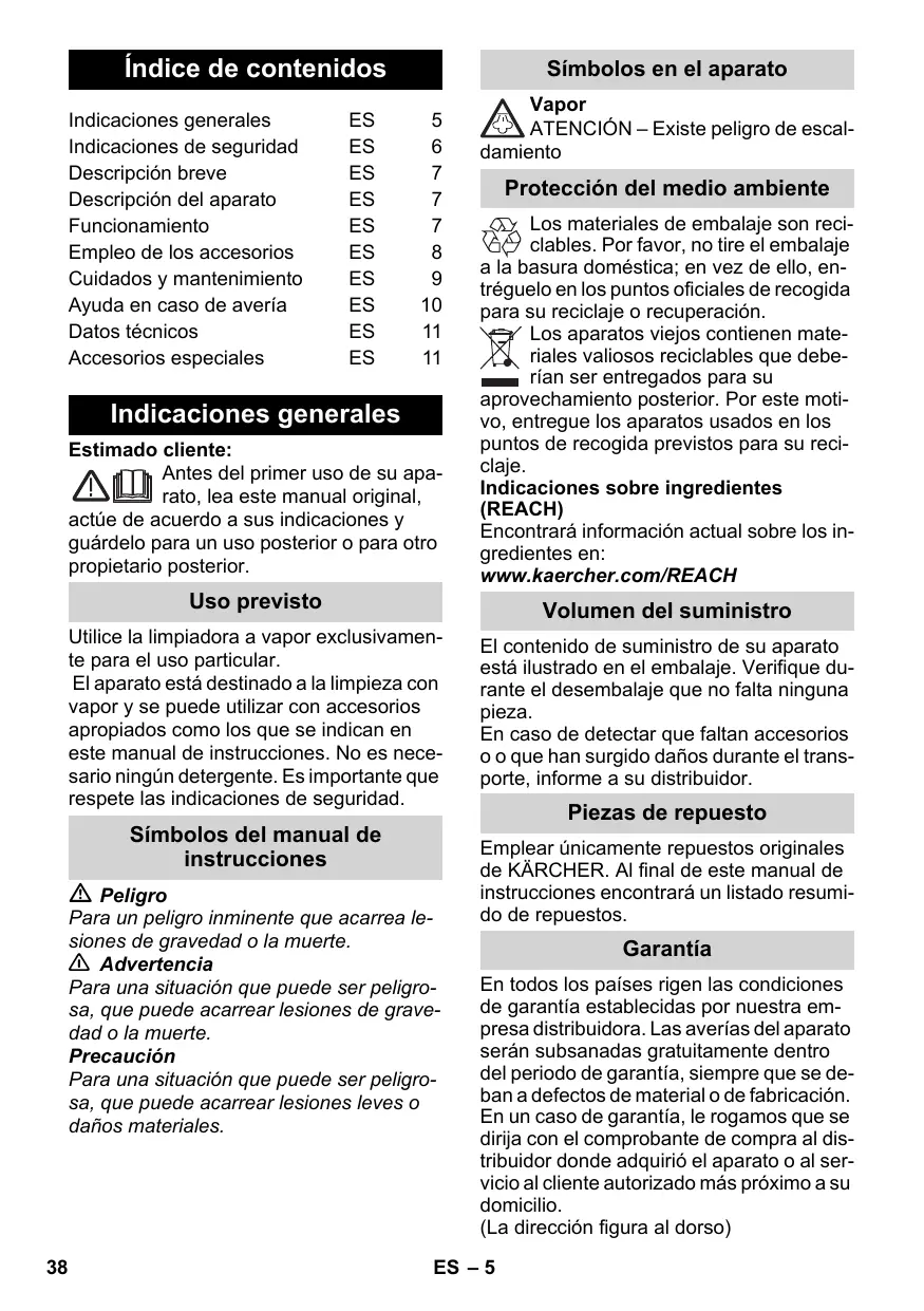 Protección del medio ambiente Estimado cliente: Antes del primer uso de su aparato, lea este manual original, actúe de acuerdo a sus indicaciones y guárdelo para un uso posterior o para otro propietario posterior. Los materiales de embalaje son reciclables. Por favor, no tire el embalaje a la basura doméstica; en vez de ello, entréguelo en los puntos oficiales de recogida para su reciclaje o recuperación. Los aparatos viejos contienen materiales valiosos reciclables que deberían ser entregados para su aprovechamiento posterior. Por este motivo, entregue los aparatos usados en los puntos de recogida previstos para su reciclaje. Indicaciones sobre ingredientes (REACH) Encontrará información actual sobre los ingredientes en: www.kaercher.com/REACH Uso previsto Volumen del suministro Utilice la limpiadora a vapor exclusivamente para el uso particular. El aparato está destinado a la limpieza con vapor y se puede utilizar con accesorios apropiados como los que se indican en este manual de instrucciones. No es necesario ningún detergente. Es importante que respete las indicaciones de seguridad. El contenido de suministro de su aparato está ilustrado en el embalaje. Verifique durante el desembalaje que no falta ninguna pieza. En caso de detectar que faltan accesorios o o que han surgido daños durante el transporte, informe a su distribuidor. Indicaciones generales Símbolos del manual de instrucciones Peligro Para un peligro inminente que acarrea lesiones de gravedad o la muerte. 몇 Advertencia Para una situación que puede ser peligrosa, que puede acarrear lesiones de gravedad o la muerte. Precaución Para una situación que puede ser peligrosa, que puede acarrear lesiones leves o daños materiales.