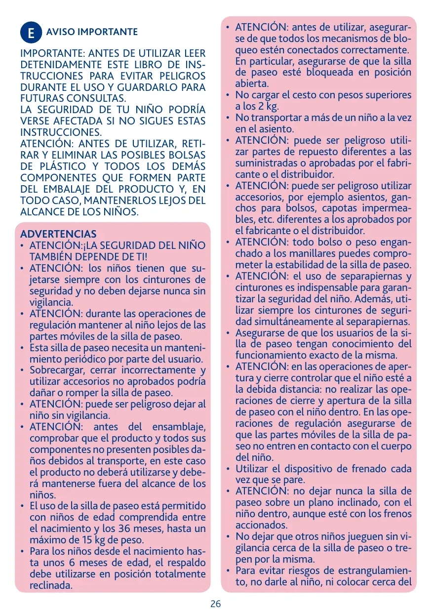 ATENCIÓN: cuando no se utilice, mantener la silla de paseo fuera del alcance de los niños. ATENCIÓN: la silla de paseo no debe utilizarse mientras se corra o se patine. Evitar el contacto de la silla de paseo con agua salina para prevenir la formación de óxido. No utilizar la silla de paseo en la playa. ATENCIÓN: este producto debe ser utilizado únicamente por un adulto.