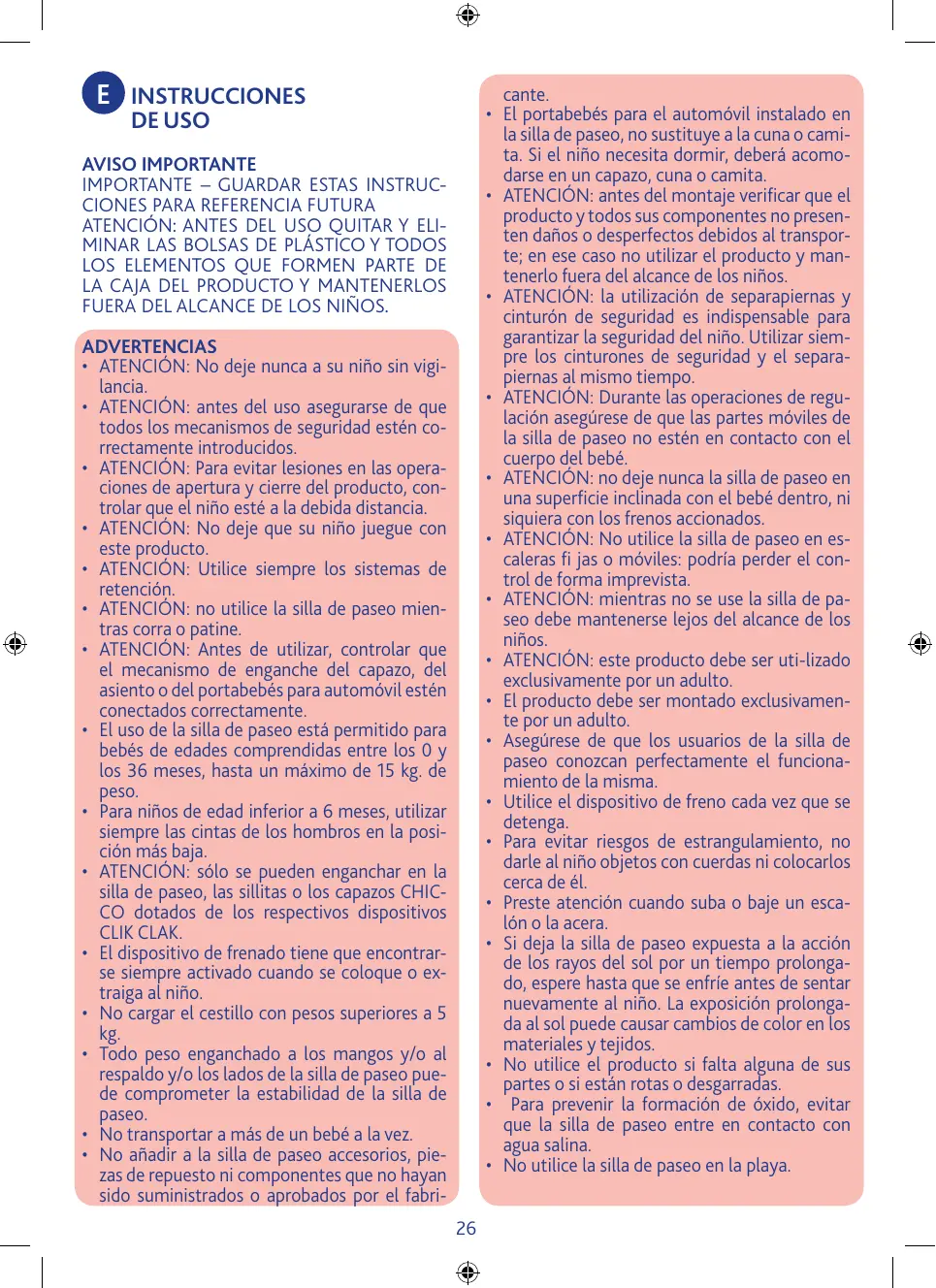 ADVERTENCIAS • ATENCIÓN: No deje nunca a su niño sin vigilancia. • ATENCIÓN: antes del uso asegurarse de que todos los mecanismos de seguridad estén correctamente introducidos. • ATENCIÓN: Para evitar lesiones en las operaciones de apertura y cierre del producto, controlar que el niño esté a la debida distancia. • ATENCIÓN: No deje que su niño juegue con este producto. • ATENCIÓN: Utilice siempre los sistemas de retención. • ATENCIÓN: no utilice la silla de paseo mientras corra o patine. • ATENCIÓN: Antes de utilizar, controlar que el mecanismo de enganche del capazo, del asiento o del portabebés para automóvil estén conectados correctamente. • El uso de la silla de paseo está permitido para bebés de edades comprendidas entre los 0 y los 36 meses, hasta un máximo de 15 kg. de peso. • Para niños de edad inferior a 6 meses, utilizar siempre las cintas de los hombros en la posición más baja. • ATENCIÓN: sólo se pueden enganchar en la silla de paseo, las sillitas o los capazos CHICCO dotados de los respectivos dispositivos CLIK CLAK. • El dispositivo de frenado tiene que encontrarse siempre activado cuando se coloque o extraiga al niño. • No cargar el cestillo con pesos superiores a 5 kg. • Todo peso enganchado a los mangos y/o al respaldo y/o los lados de la silla de paseo puede comprometer la estabilidad de la silla de paseo. • No transportar a más de un bebé a la vez. • No añadir a la silla de paseo accesorios, piezas de repuesto ni componentes que no hayan sido suministrados o aprobados por el fabri26