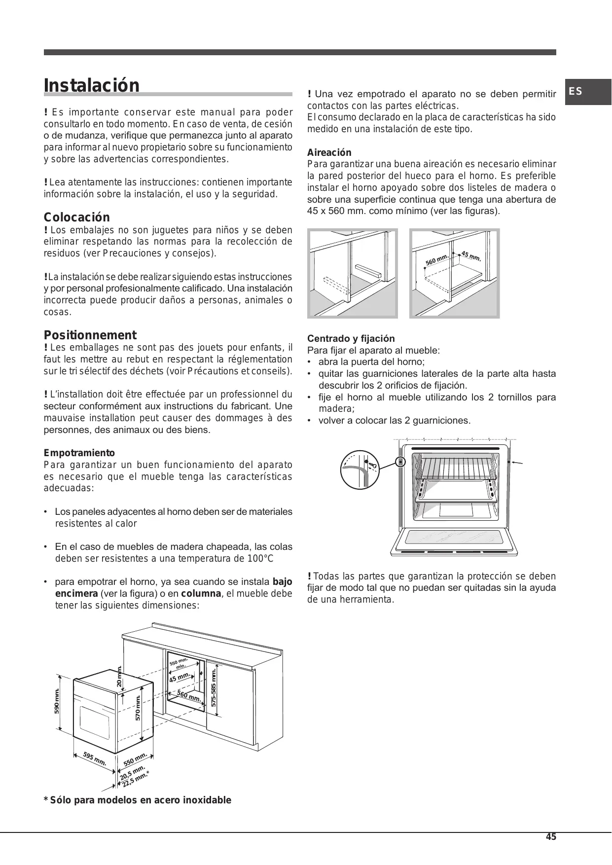 Instalación ! Es importante conservar este manual para poder consultarlo en todo momento. En caso de venta, de cesión o de mudanza, verifique que permanezca junto al aparato para informar al nuevo propietario sobre su funcionamiento y sobre las advertencias correspondientes. ! Lea atentamente las instrucciones: contienen importante información sobre la instalación, el uso y la seguridad. Colocación ! Los embalajes no son juguetes para niños y se deben eliminar respetando las normas para la recolección de residuos (ver Precauciones y consejos). ! Una vez empotrado el aparato no se deben permitir contactos con las partes eléctricas. El consumo declarado en la placa de características ha sido medido en una instalación de este tipo. Aireación Para garantizar una buena aireación es necesario eliminar la pared posterior del hueco para el horno. Es preferible instalar el horno apoyado sobre dos listeles de madera o sobre una superficie continua que tenga una abertura de 45 x 560 mm. como mínimo (ver las figuras).