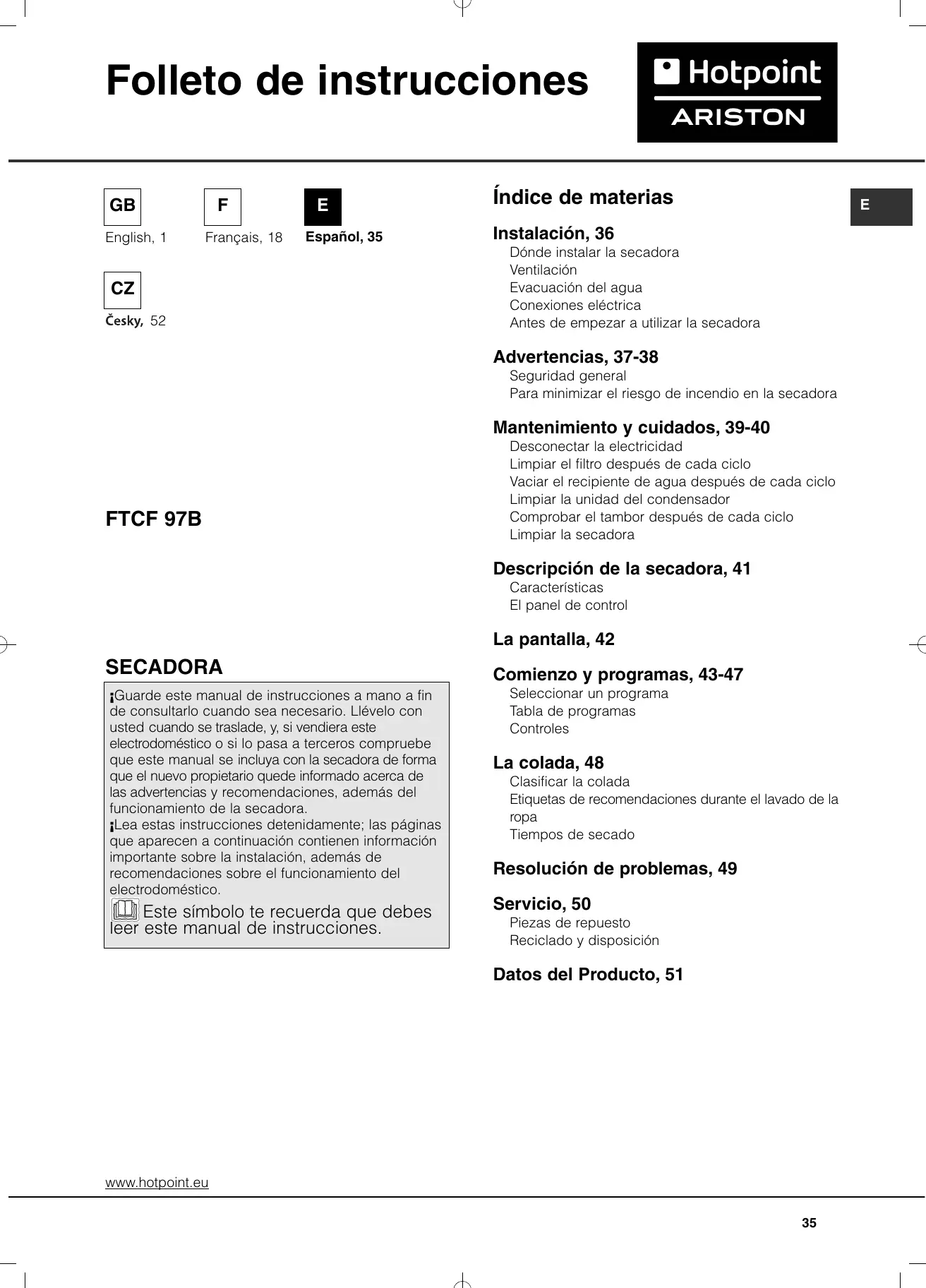 Instalación, 36 Dónde instalar la secadora Ventilación Evacuación del agua Conexiones eléctrica Antes de empezar a utilizar la secadora Advertencias, 37-38 Seguridad general Para minimizar el riesgo de incendio en la secadora Mantenimiento y cuidados, 39-40 FTCF 97B Desconectar la electricidad Limpiar el filtro después de cada ciclo Vaciar el recipiente de agua después de cada ciclo Limpiar la unidad del condensador Comprobar el tambor después de cada ciclo Limpiar la secadora Descripción de la secadora, 41 Características El panel de control La pantalla, 42 SECADORA ¡Guarde este manual de instrucciones a mano a fin de consultarlo cuando sea necesario. Llévelo con usted cuando se traslade, y, si vendiera este electrodoméstico o si lo pasa a terceros compruebe que este manual se incluya con la secadora de forma que el nuevo propietario quede informado acerca de las advertencias y recomendaciones, además del funcionamiento de la secadora. ¡Lea estas instrucciones detenidamente; las páginas que aparecen a continuación contienen información importante sobre la instalación, además de recomendaciones sobre el funcionamiento del electrodoméstico. Este símbolo te recuerda que debes leer este manual de instrucciones. Comienzo y programas, 43-47 Seleccionar un programa Tabla de programas Controles La colada, 48 Clasificar la colada Etiquetas de recomendaciones durante el lavado de la ropa Tiempos de secado Resolución de problemas, 49 Servicio, 50 Piezas de repuesto Reciclado y disposición Datos del Producto, 51 www.hotpoint.eu