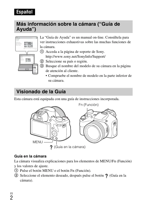 - Compruebe el nombre de modelo en la parte inferior de su cámara. Visionado de la Guía Esta cámara está equipada con una guía de instrucciones incorporada. Fn (Función) MENU (Guía en la cámara) Guía en la cámara La cámara visualiza explicaciones para los elementos de MENU/Fn (Función) y los valores de ajuste. 1 Pulse el botón MENU o el botón Fn (Función). 2 Seleccione el elemento deseado, después pulse el botón (Guía en la cámara).