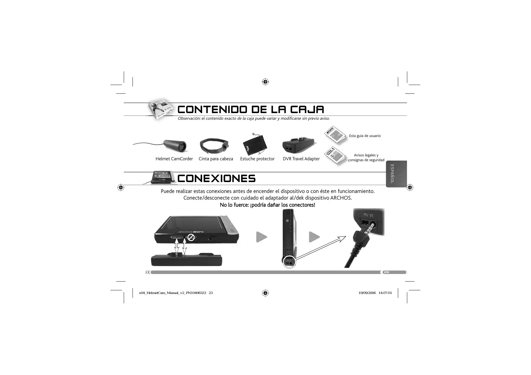 Observación: el contenido exacto de la caja puede variar y modificarse sin previo aviso. Helmet CamCorder Cinta para cabeza Estuche protector Esta guía de usuario Avisos legales y consignas de seguridad ESPAÑOL CONEXIONES Puede realizar estas conexiones antes de encender el dispositivo o con éste en funcionamiento. Conecte/desconecte con cuidado el adaptador al/dek dispositivo ARCHOS. No lo fuerce: ¡podría dañar los conectores!