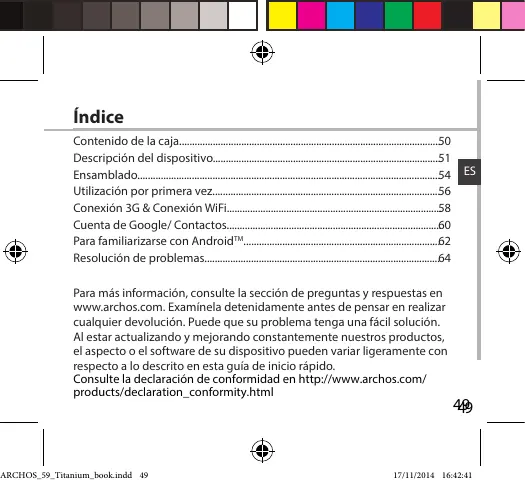 indice CR PA Para més informacién, consulte la secciôn de preguntas y respuestas en wwwarchos.com. Examinela detenidamente antes de pensar en realizar cualquier devoluciôn. Puede que su problema tenga una fécil soluciôn. Alestar actualizando y mejorando constantemente nuestros productos, el aspecto 0 el software de su dispositivo pueden variar ligeramente con respecto a lo descrito en esta guia de inicio répido. Consulte la declaracién de conformidad en htip:/ivww.archos.com/ products/declaration_conformity.html