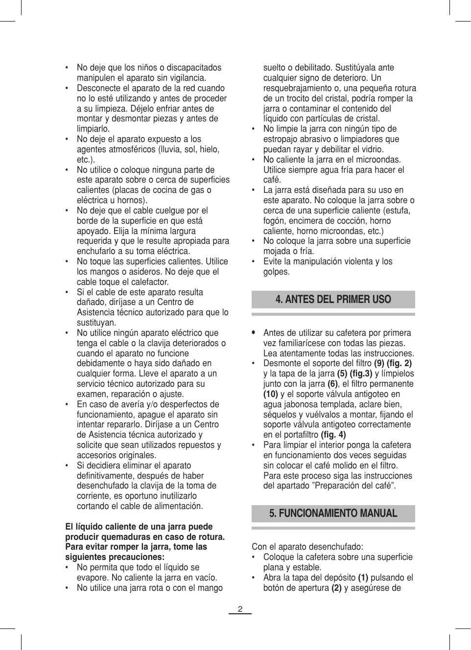 Desmonte el soporte del filtro (9) (fig. 2) y la tapa de la jarra (5) (fig.3) y limpielos jusqu con la jarra (6),el filtro permanente (10) y el soporte valvula antigoteo en agua jabonosa Templada, aclare bien, sequelos y vuelvalos a montar, fijando el soporte valvula antigoteo correctamente en el portafiltro (fig.4) - Para limpar el interiorponglacafetera enfuncionamente dos veces seguidas sin colocar el cafe molido en el filtro. Para este procesosiga las instrucciones del apartado "Preparacion del cafe".