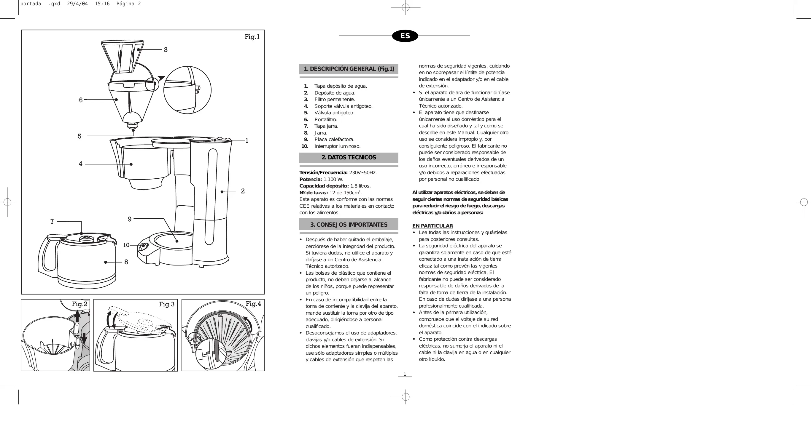 Tensión/Frecuencia: 230V~50Hz. Potencia: 1.100 W. Capacidad depósito: 1,8 litros. Nº de tazas: 12 de 150cm3. Este aparato es conforme con las normas CEE relativas a los materiales en contacto con los alimentos. Al utilizar aparatos eléctricos, se deben de seguir ciertas normas de seguridad básicas para reducir el riesgo de fuego, descargas eléctricas y/o daños a personas: