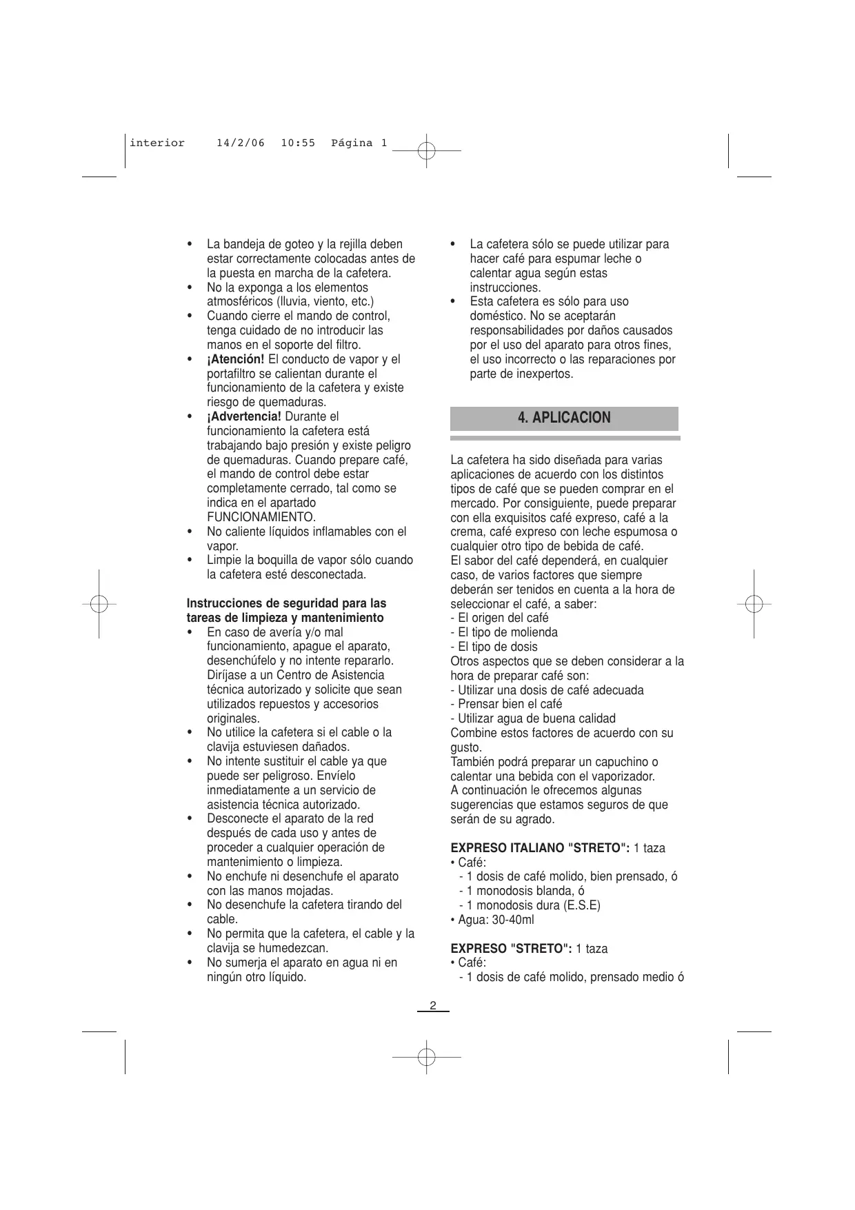 interior 14/2/06 10:55 Página 2 funcionamiento mediante el interruptor marcha / paro (E). El indicador luminoso rojo (C) se encenderá para indicar que la cafetera está en marcha.