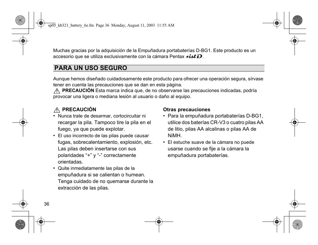 Aunque hemos diseñado cuidadosamente este producto para ofrecer una operación segura, sírvase tener en cuenta las precauciones que se dan en esta página. PRECAUCIÓN Esta marca indica que, de no observarse las precauciones indicadas, podría provocar una ligera o mediana lesión al usuario o daño al equipo. PRECAUCIÓN