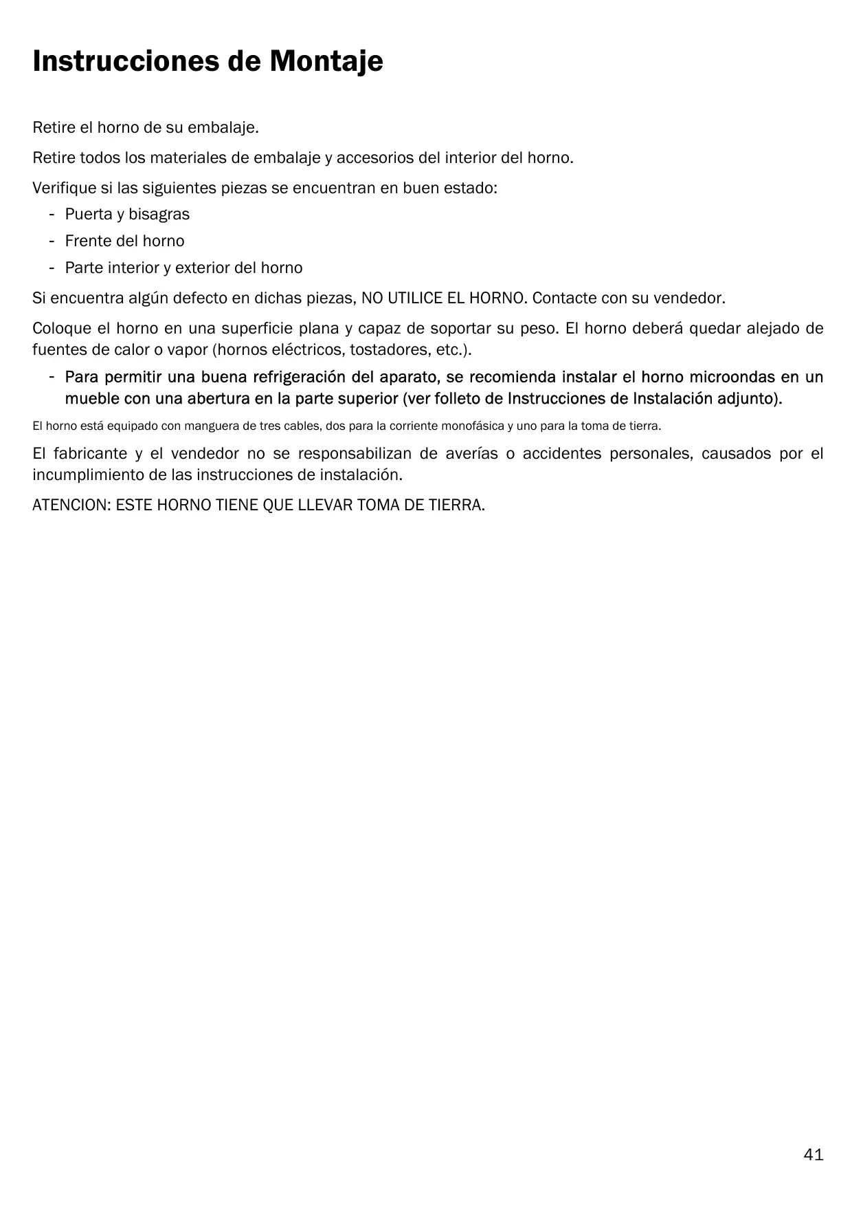 Instrucciones de Montaje Retire el horno de su embalaje. Retire todos los materiales de embalaje y accesorios del interior del horno. Verifique si las siguientes piezas se encuentran en buen estado: - Puerta y bisagras - Frente del horno - Parte interior y exterior del horno Si encuentra algún defecto en dichas piezas, NO UTILICE EL HORNO. Contacte con su vendedor. Coloque el horno en una superficie plana y capaz de soportar su peso. El horno deberá quedar alejado de fuentes de calor o vapor (hornos eléctricos, tostadores, etc.). - Para permitir una buena refrigeración del aparato, se recomienda instalar el horno microondas en un mueble con una abertura en la parte superior (ver folleto de Instrucciones de Instalación adjunto). El horno está equipado con manguera de tres cables, dos para la corriente monofásica y uno para la toma de tierra. El fabricante y el vendedor no se responsabilizan de averías o accidentes personales, causados por el incumplimiento de las instrucciones de instalación. ATENCION: ESTE HORNO TIENE QUE LLEVAR TOMA DE TIERRA.