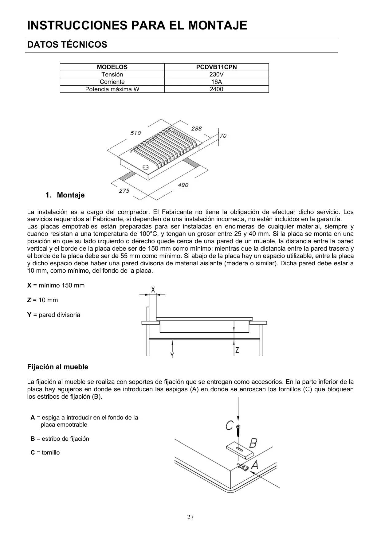 Las instalas empotrables estan preparadas para ser instaladas en encimeras de qualquier material, siempre y cuando resistan a una temperatura de 100^ , y tengan un grosor entre 25 y 40 mm. Si la plac se monta en una posicion en que su lado izquierdo o derecho quedeoca de una pared de un mueble, la distancia entre la pared vertical y el borde de la plac debe ser de 150 mm como minimo;@masonas que la distancia entre la pared trasa y el borde de la plac debe ser de 55 mm como minimo. Si abajo de la plac hay un espioutilizable, entre la plac y dicho espacio debe haber una pared divisoria de material aislante (madero or similar). Dicha pared debe estar a 10 mm, como minimo, del fondo de la plac.