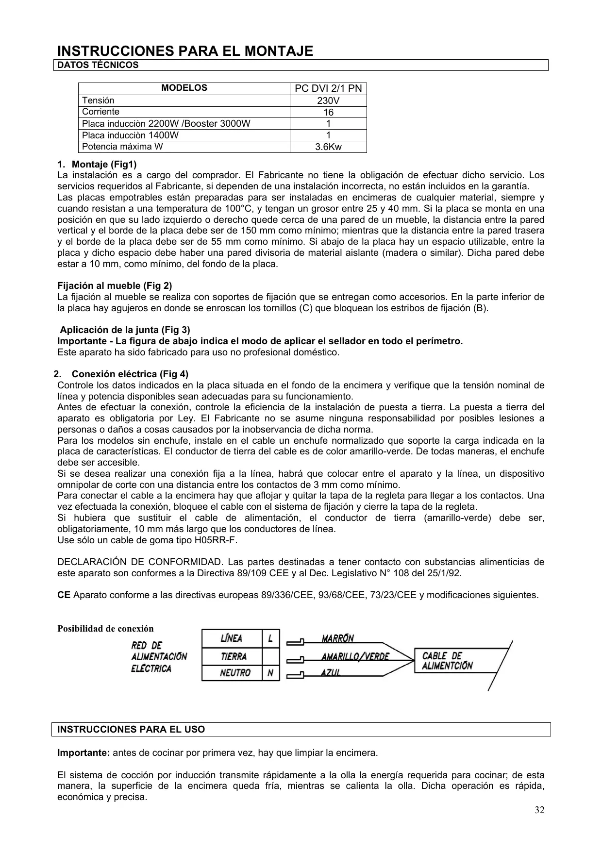 Controle los datos indicados en la placa situada en el fondo de la encimera y verifique que la tensión nominal de línea y potencia disponibles sean adecuadas para su funcionamiento. Antes de efectuar la conexión, controle la eficiencia de la instalación de puesta a tierra. La puesta a tierra del aparato es obligatoria por Ley. El Fabricante no se asume ninguna responsabilidad por posibles lesiones a personas o daños a cosas causados por la inobservancia de dicha norma. Para los modelos sin enchufe, instale en el cable un enchufe normalizado que soporte la carga indicada en la placa de características. El conductor de tierra del cable es de color amarillo-verde. De todas maneras, el enchufe debe ser accesible. Si se desea realizar una conexión fija a la línea, habrá que colocar entre el aparato y la línea, un dispositivo omnipolar de corte con una distancia entre los contactos de 3 mm como mínimo. Para conectar el cable a la encimera hay que aflojar y quitar la tapa de la regleta para llegar a los contactos. Una vez efectuada la conexión, bloquee el cable con el sistema de fijación y cierre la tapa de la regleta. Si hubiera que sustituir el cable de alimentación, el conductor de tierra (amarillo-verde) debe ser, obligatoriamente, 10 mm más largo que los conductores de línea. Use sólo un cable de goma tipo H05RR-F. DECLARACIÓN DE CONFORMIDAD. Las partes destinadas a tener contacto con substancias alimenticias de este aparato son conformes a la Directiva 89/109 CEE y al Dec. Legislativo N° 108 del 25/1/92. CE Aparato conforme a las directivas europeas 89/336/CEE, 93/68/CEE, 73/23/CEE y modificaciones siguientes. Posibilidad de conexión
