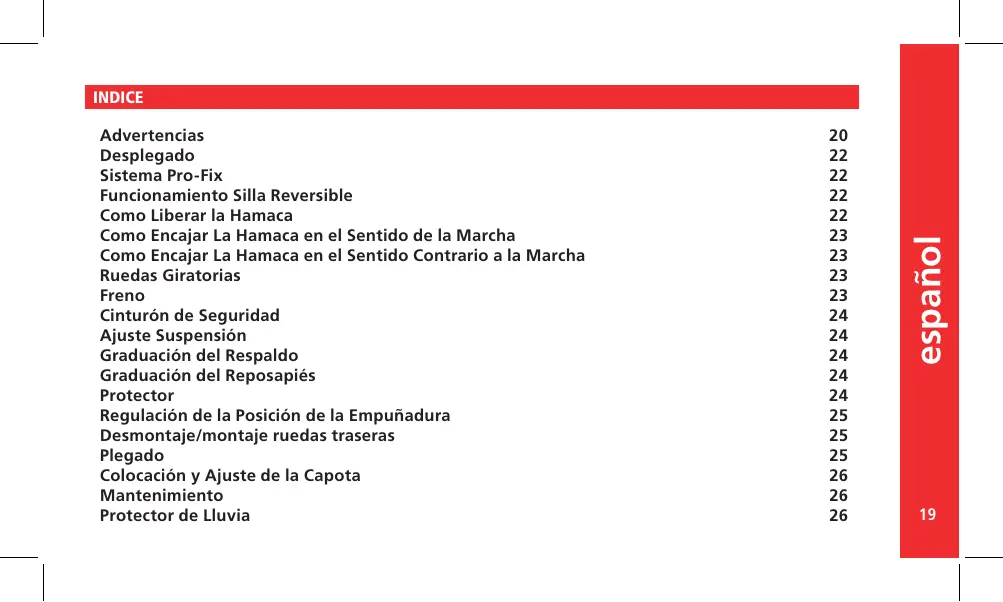 Advertencias Desplegado Sistema Pro-Fix Funcionamiento Silla Reversible Como Liberar la Hamaca Como Encajar La Hamaca en el Sentido de la Marcha Como Encajar La Hamaca en el Sentido Contrario a la Marcha Ruedas Giratorias Freno Cinturón de Seguridad Ajuste Suspensión Graduación del Respaldo Graduación del Reposapiés Protector Regulación de la Posición de la Empuñadura Desmontaje/montaje ruedas traseras Plegado Colocación y Ajuste de la Capota Mantenimiento Protector de Lluvia