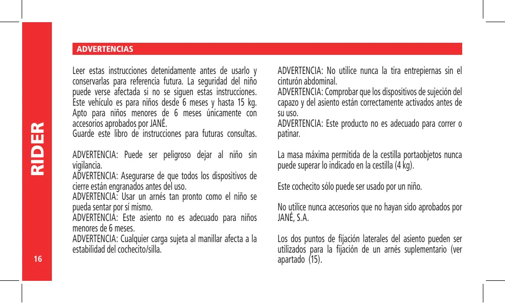 Leer estas instrucciones detenidamente antes de usarlo y conservarlas para referencia futura. La seguridad del niño puede verse afectada si no se siguen estas instrucciones. Este vehículo es para niños desde 6 meses y hasta 15 kg. Apto para niños menores de 6 meses únicamente con accesorios aprobados por JANÉ. Guarde este libro de instrucciones para futuras consultas. ADVERTENCIA: No utilice nunca la tira entrepiernas sin el cinturón abdominal. ADVERTENCIA: Comprobar que los dispositivos de sujeción del capazo y del asiento están correctamente activados antes de su uso. ADVERTENCIA: Este producto no es adecuado para correr o patinar. ADVERTENCIA: Puede ser peligroso dejar al niño sin vigilancia. ADVERTENCIA: Asegurarse de que todos los dispositivos de cierre están engranados antes del uso. ADVERTENCIA: Usar un arnés tan pronto como el niño se pueda sentar por sí mismo. ADVERTENCIA: Este asiento no es adecuado para niños menores de 6 meses. ADVERTENCIA: Cualquier carga sujeta al manillar afecta a la estabilidad del cochecito/silla. La masa máxima permitida de la cestilla portaobjetos nunca puede superar lo indicado en la cestilla (4 kg). Este cochecito sólo puede ser usado por un niño. No utilice nunca accesorios que no hayan sido aprobados por JANÉ, S.A. Los dos puntos de fijación laterales del asiento pueden ser utilizados para la fijación de un arnés suplementario (ver apartado (15). ADVERTENCIA: El niño debe mantenerse alejado de partes móviles cuando estas están siendo manipuladas por el adulto responsable. La aparición de puntos de corte y compresión y atrapamientos son inevitables durante estas operaciones. ADVERTENCIA: Nunca permita que el niño se ponga de pie en el reposapiés o estribo. ADVERTENCIA: Es imprescindible asegurarse que el niño se mantiene alejado de la silla durante las acciones de plegado y desplegado. La aparición de puntos de corte y compresión y atrapamientos son inevitables durante estas operaciones. ADVERTENCIA: Una vez accionado el freno asegúrese de que el cochecito ha quedado correctamente frenado. Puede ser necesario rodar ligeramente el cochecito para que el freno engrane de manera óptima. español ADVERTENCIA: Nunca deje al niño en el cochecito a la hora de subir o bajar escaleras o al viajar en algún medio de transporte. ADVERTENCIA: No colocar peso encima de la capota.