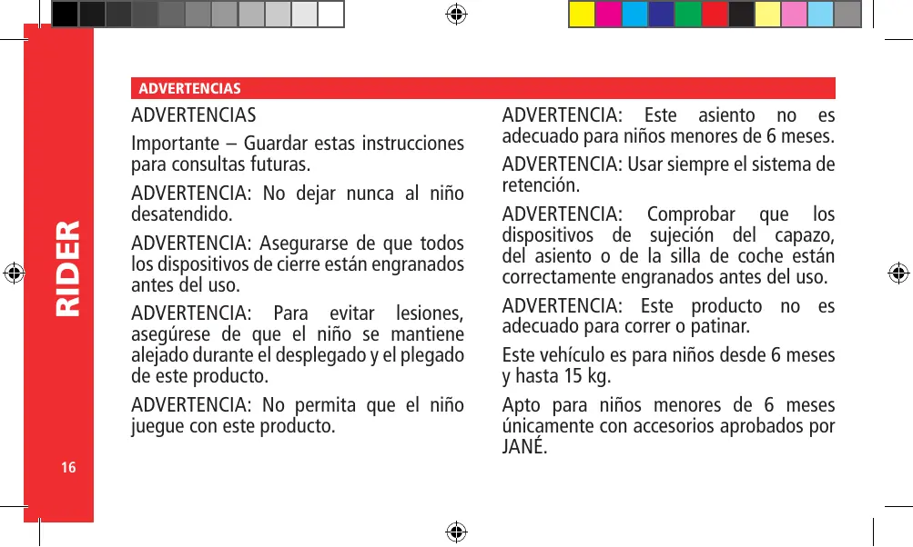 ADVERTENCIAS Importante – Guardar estas instrucciones para consultas futuras. ADVERTENCIA: No dejar nunca al niño desatendido. ADVERTENCIA: Asegurarse de que todos los dispositivos de cierre están engranados antes del uso. ADVERTENCIA: Para evitar lesiones, asegúrese de que el niño se mantiene alejado durante el desplegado y el plegado de este producto. ADVERTENCIA: No permita que el niño juegue con este producto. ADVERTENCIA: Este asiento no es adecuado para niños menores de 6 meses. ADVERTENCIA: Usar siempre el sistema de retención. ADVERTENCIA: Comprobar que los dispositivos de sujeción del capazo, del asiento o de la silla de coche están correctamente engranados antes del uso. ADVERTENCIA: Este producto no es adecuado para correr o patinar. Este vehículo es para niños desde 6 meses y hasta 15 kg. Apto para niños menores de 6 meses únicamente con accesorios aprobados por JANÉ. Solo deben utilizarse los repuestos suministrados o recomendados por JANÉ. La masa máxima permitida de la cestilla portaobjetos nunca puede superar lo indicado en la cestilla (4 kg). español El dispositivo de estacionamiento debe activarse al colocar y retirar a los niños del vehículo. Cualquier carga fijada al manillar y/o a la parte trasera del respaldo y/o a los laterales del vehículo afecta a la estabilidad de éste. Este vehículo ha sido diseñado para un único niño, no utilizarlo con más niños a la vez. No deben utilizarse accesorios no aprobados por JANÉ. Para las sillas de coche usadas junto con un chasis, este vehículo no reemplaza una cuna o cama. Si el niño necesita dormir, debería colocarse en un capazo, una cuna o una cama adecuados.