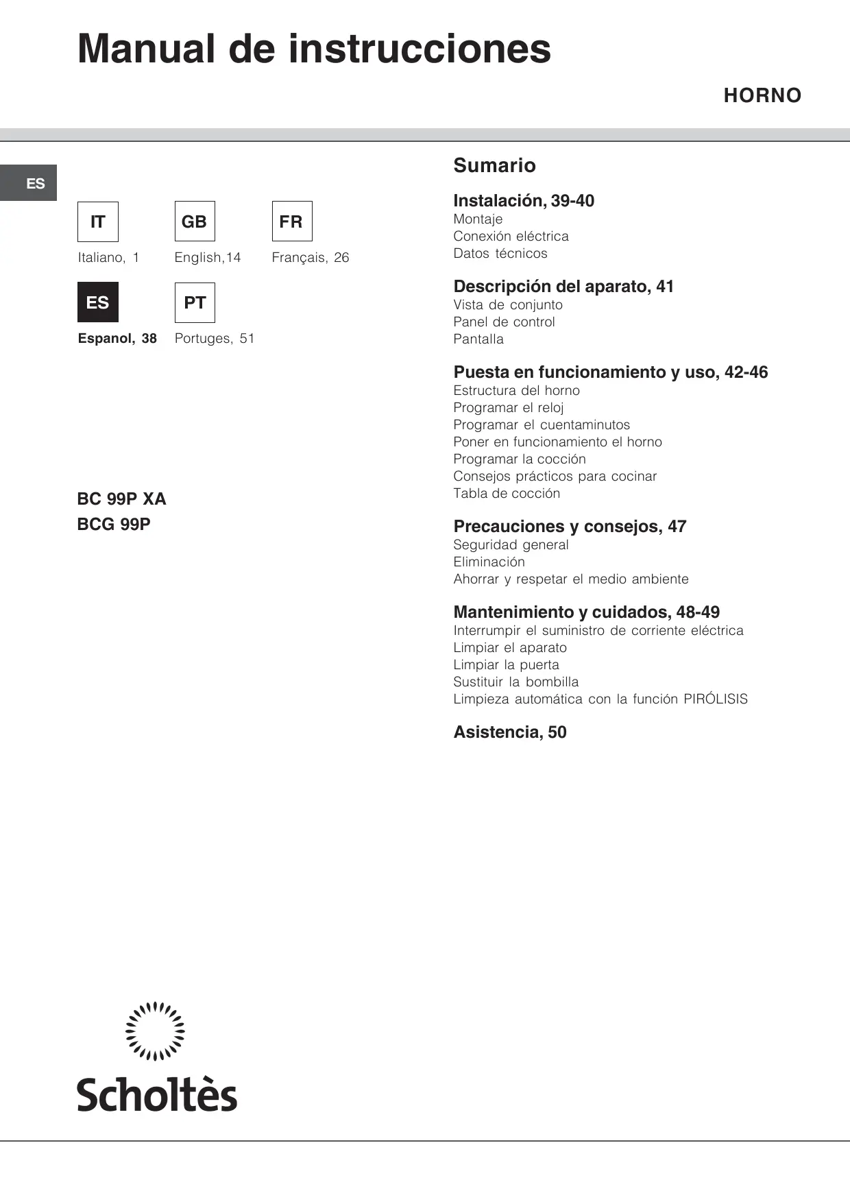 BCG 99 P - Horno SCHOLTES - Manual de uso y guía de instrucciones gratis
