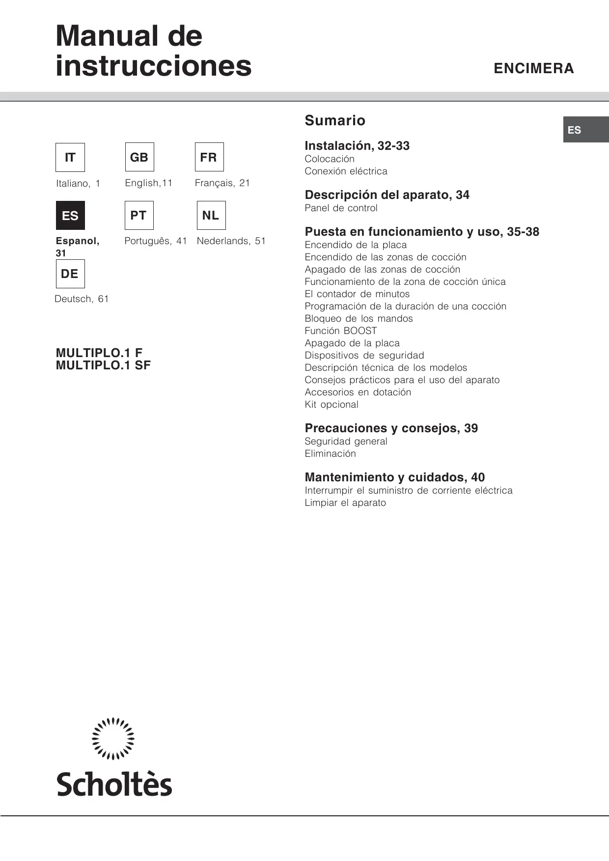Manual de instrucciones ENCIMERA Instalación, 32-33 Colocación Conexión eléctrica Descripción del aparato, 34 Panel de control Puesta en funcionamiento y uso, 35-38 Encendido de la placa Encendido de las zonas de cocción Apagado de las zonas de cocción Funcionamiento de la zona de cocción única El contador de minutos Programación de la duración de una cocción Bloqueo de los mandos Función BOOST Apagado de la placa Dispositivos de seguridad Descripción técnica de los modelos Consejos prácticos para el uso del aparato Accesorios en dotación Kit opcional Precauciones y consejos, 39 Seguridad general Eliminación Mantenimiento y cuidados, 40 Interrumpir el suministro de corriente eléctrica Limpiar el aparato