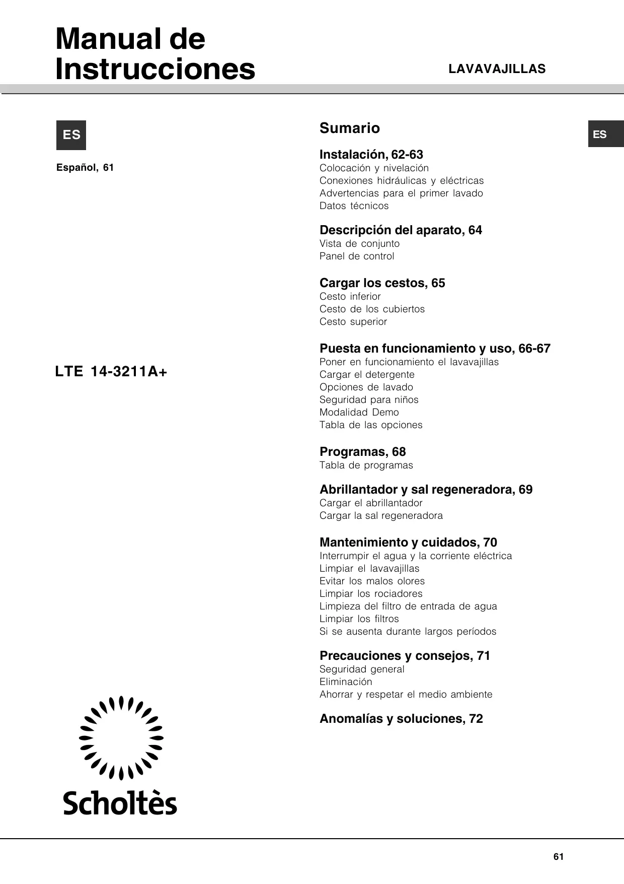 LTE 14-3211 A - Lavavajillas SCHOLTES - Manual de uso y guía de instrucciones gratis