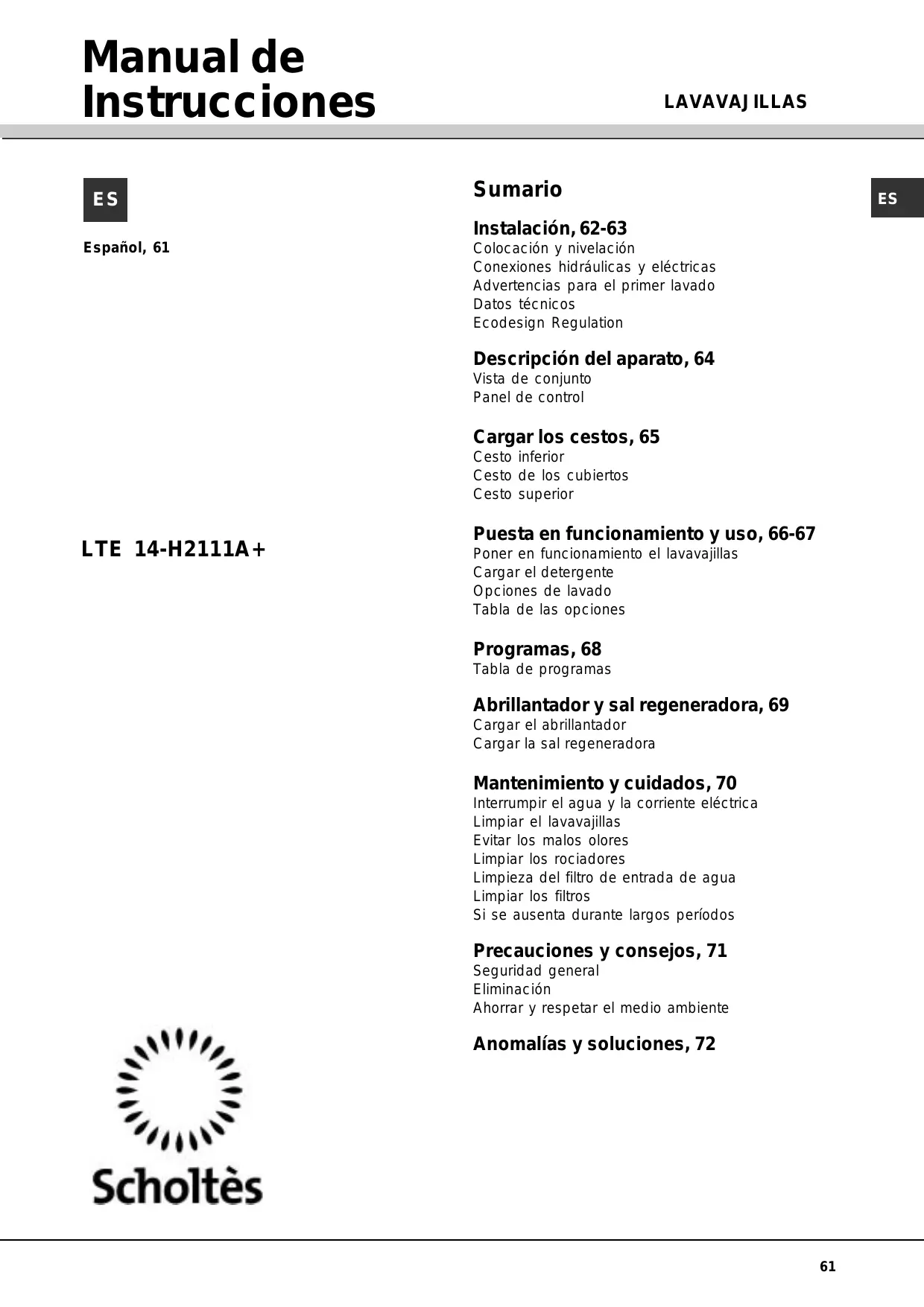 Puesta en funcionamiento y uso, 66-67 Poner en funcionamiento el lavavajillas Cargar el detergente Opciones de lavado Tabla de las opciones Programas, 68 Tabla de programas Abrillantador y sal regeneradora, 69 Cargar el abrillantador Cargar la sal regeneradora Mantenimiento y cuidados, 70 Interrumpir el agua y la corriente eléctrica Limpiar el lavavajillas Evitar los malos olores Limpiar los rociadores Limpieza del filtro de entrada de agua Limpiar los filtros Si se ausenta durante largos períodos Precauciones y consejos, 71 Seguridad general Eliminación Ahorrar y respetar el medio ambiente Anomalías y soluciones, 72