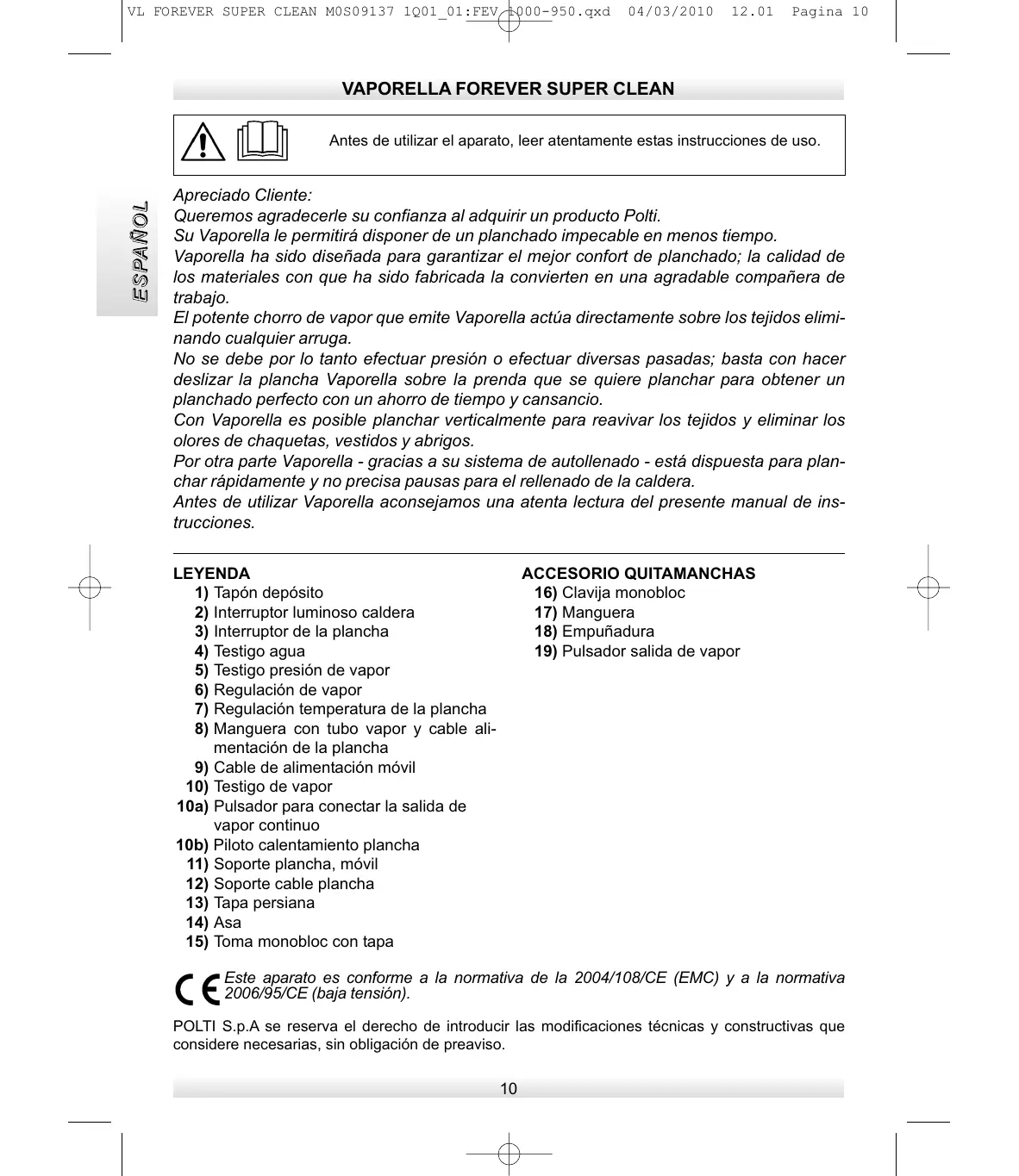 Descarga las instrucciones para tu Plancha de vapor en formato PDF gratis! Encuentra tus instrucciones VAPORELLA FOREVER SUPER CLEAN - POLTI y toma tu dispositivo electrónico nuevamente en la mano. En esta página están publicados todos los documentos necesarios para el uso de su dispositivo. VAPORELLA FOREVER SUPER CLEAN de la marca POLTI.