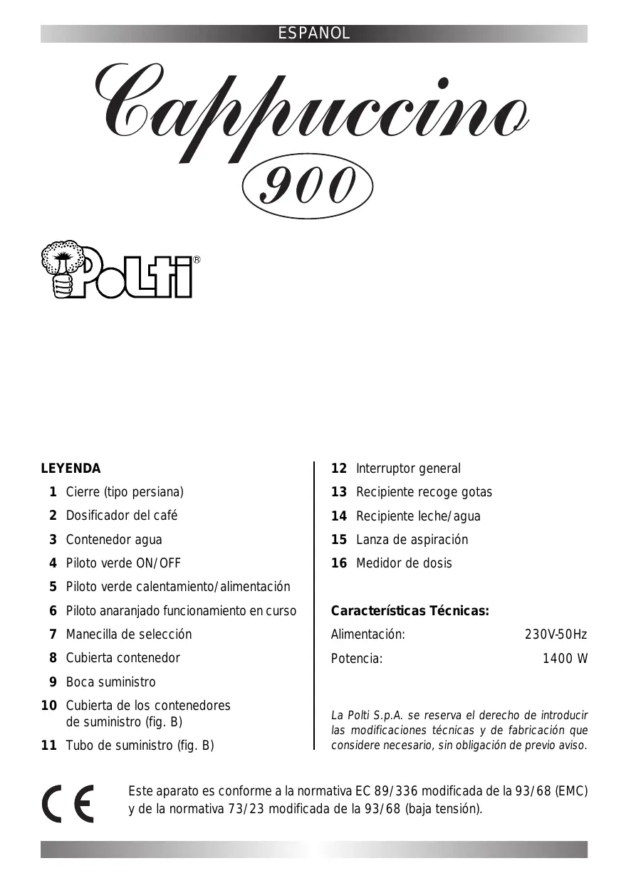 Descarga las instrucciones para tu Maquina de cafe en formato PDF gratis! Encuentra tus instrucciones CAPPUCCINO 900 - POLTI y toma tu dispositivo electrónico nuevamente en la mano. En esta página están publicados todos los documentos necesarios para el uso de su dispositivo. CAPPUCCINO 900 de la marca POLTI.