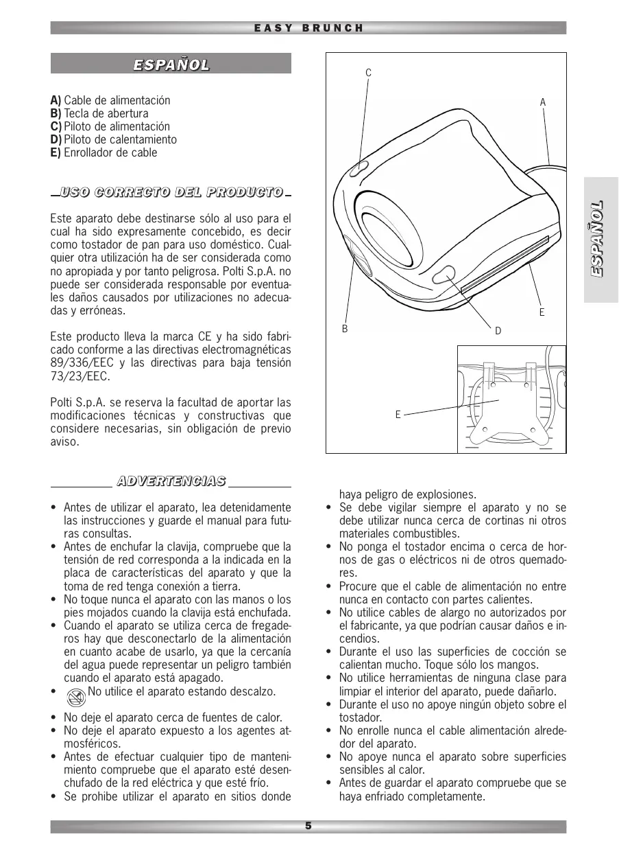 Este aparato debe destinarse sólo al uso para el cual ha sido expresamente concebido, es decir como tostador de pan para uso doméstico. Cualquier otra utilización ha de ser considerada como no apropiada y por tanto peligrosa. Polti S.p.A. no puede ser considerada responsable por eventuales daños causados por utilizaciones no adecuadas y erróneas.