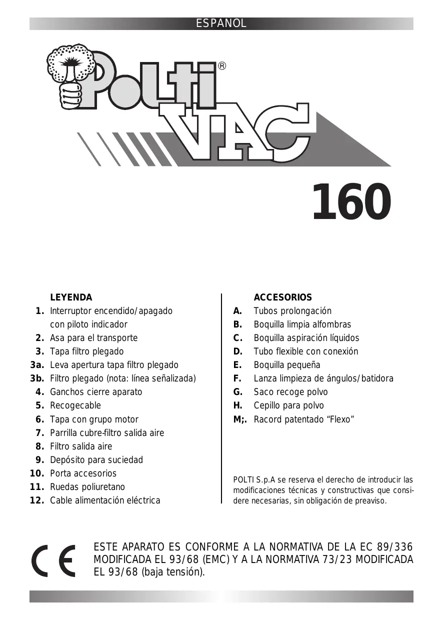 VAC 160 - Aspiradora POLTI - Manual de uso y guía de instrucciones gratis