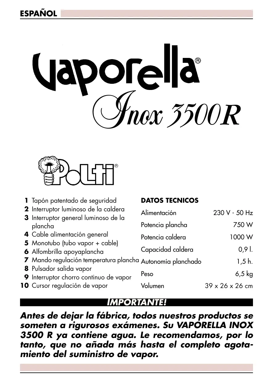 Inox 3500R 1 Tapón patentado de seguridad DATOS TECNICOS 2 Interruptor luminoso de la caldera Alimentación 230 V - 50 Hz 3 Interruptor general luminoso de la Potencia plancha 750 W plancha 4 Cable alimentación general Potencia caldera 1000 W 5 Monotubo (tubo vapor + cable) Capacidad caldera 0,9 l. 6 Alfombrilla apoyaplancha 7 Mando regulación temperatura plancha Autonomía planchado 1,5 h. 8 Pulsador salida vapor Peso 6,5 kg 9 Interruptor chorro continuo de vapor 10 Cursor regulación de vapor Volumen 39 x 26 x 26 cm IMPORTANTE! Antes de dejar la fábrica, todos nuestros productos se someten a rigurosos exámenes. Su VAPORELLA INOX 3500 R ya contiene agua. Le recomendamos, por lo tanto, que no añada más hasta el completo agotamiento del suministro de vapor.
