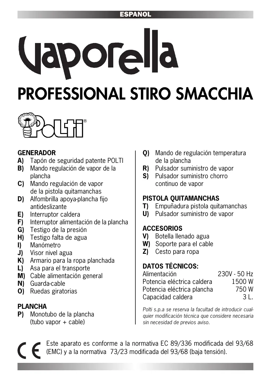W) Soporte para el cable Z) Cesto para ropa DATOS TÉCNICOS: Alimentación 230V - 50 Hz Potencia eléctrica caldera 1500 W Potencia eléctrica plancha 750 W Capacidad caldera 3 L. Polti s.p.a se reserva la facultad de introducir cualquier modificación técnica que considere necesaria sin necesidad de previos aviso. Este aparato es conforme a la normativa EC 89/336 modificada del 93/68 (EMC) y a la normativa 73/23 modificada del 93/68 (baja tensión). ESPAÑOL