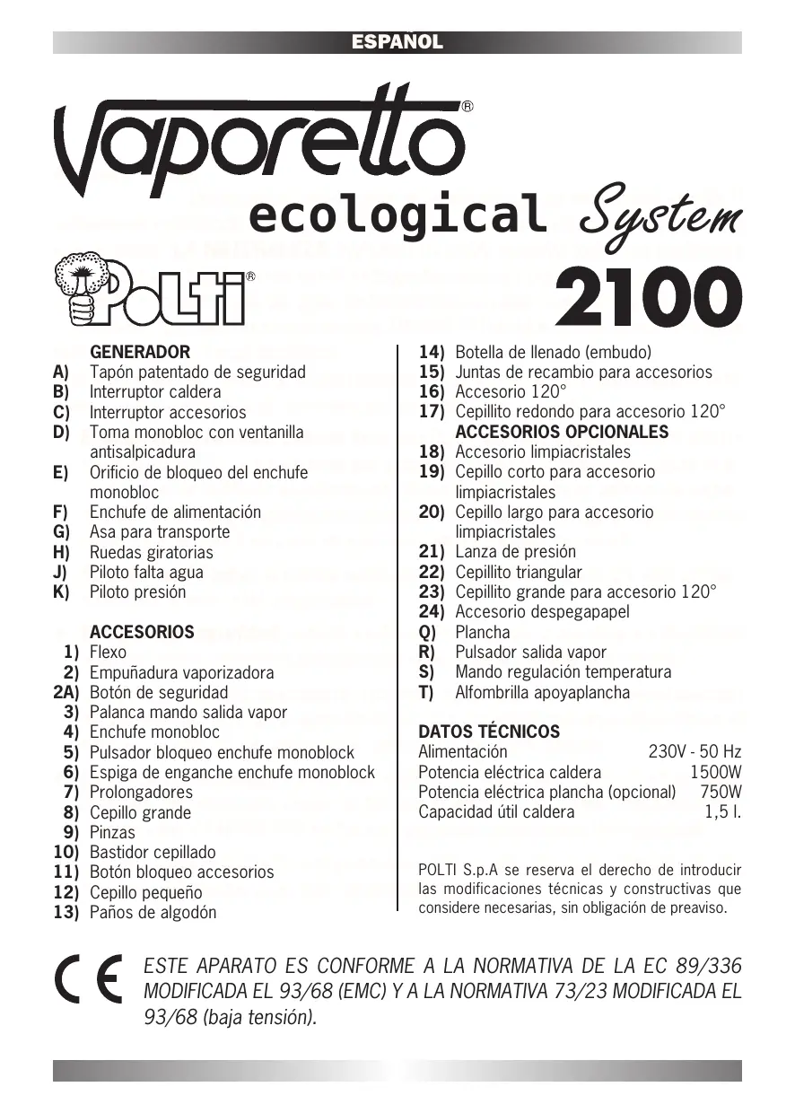 Apreciado Cliente, Quisiéramos agradecerle la confianza que ha depositado en POLTI adquiriendo este producto y su contribución a la salvaguardia del bien más precioso que tenemos: LA NATURALEZA. VAPORETTO 2100 resuelve todos los problemas de limpieza y de higiene sin el uso de detergentes tóxicos y perjudiciales para el medio ambiente: la común agua del grifo se transforma en vapor con una presión potente y constante. Aprovechando esta energía, VAPORETTO está en condiciones de limpiar