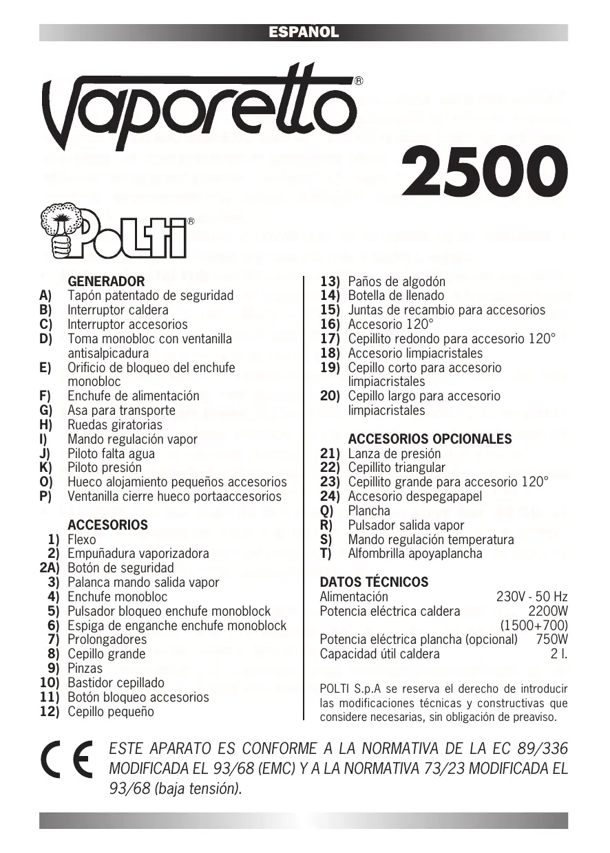 ESPAÑOL Apreciado Cliente, Quisiéramos agradecerle la confianza que ha depositado en POLTI adquiriendo este producto y su contribución a la salvaguarda del bien más precioso que tenemos: LA NATURALEZA. VAPORETTO 2500 resuelve todos los problemas de limpieza y de higiene sin el uso de detergentes tóxicos y perjudiciales para el medio ambiente: el agua del grifo se transforma en vapor con una presión potente y constante. Aprovechando esta energía, VAPORETTO está en condiciones de limpiar más a fondo y de forma ecológica. Nuestro equipo de técnicos, al proyectarlo, lo ha dotado de los instrumentos adecuados para que su trabajo sea cada vez más eficiente y seguro: