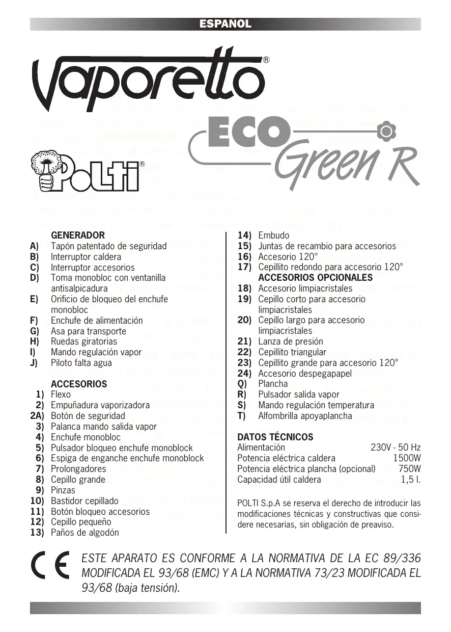 Apreciado Cliente, Quisiéramos agradecerle la confianza que ha depositado en POLTI adquiriendo este producto y su contribución a la salvaguardia del bien más precioso que tenemos: LA NATURALEZA. VAPORETTO ECO GREEN R resuelve todos los problemas de limpieza y de higiene sin el uso de detergentes tóxicos y perjudiciales para el medio ambiente: la común agua del grifo se transforma en vapor con una presión potente y constante. Aprovechando esta energía, VAPORETTO está en condiciones de limpiar más a fondo y de forma ecológica. Nuestro equipo de técnicos, al proyectarlo, lo ha dotado de los instrumentos adecuados para que su trabajo sea cada vez más eficiente y seguro:
