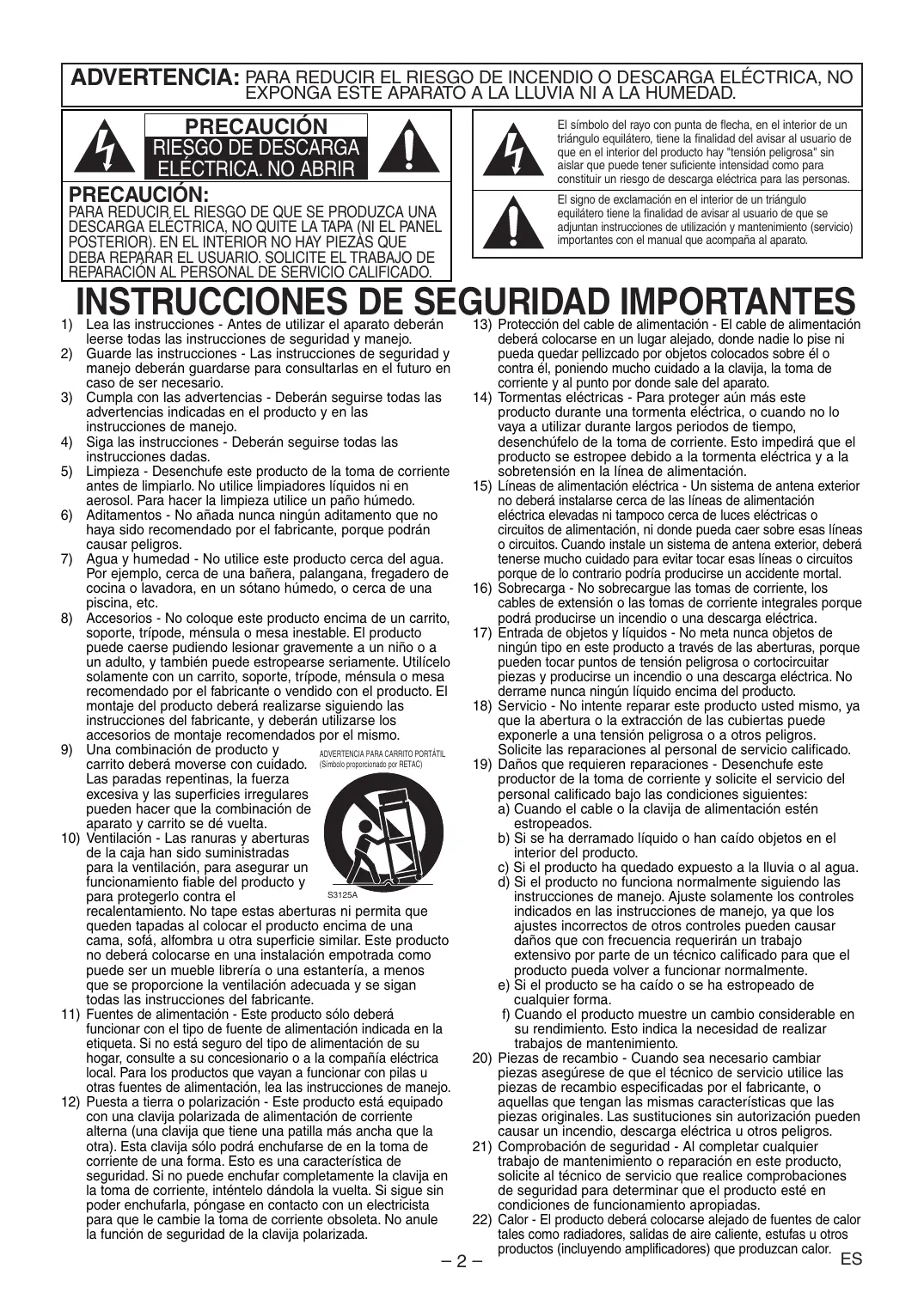 PRECAUCIÓN: El símbolo del rayo con punta de flecha, en el interior de un triángulo equilátero, tiene la finalidad del avisar al usuario de que en el interior del producto hay "tensión peligrosa" sin aislar que puede tener suficiente intensidad como para constituir un riesgo de descarga eléctrica para las personas. El signo de exclamación en el interior de un triángulo equilátero tiene la finalidad de avisar al usuario de que se adjuntan instrucciones de utilización y mantenimiento (servicio) importantes con el manual que acompaña al aparato. PARA REDUCIR EL RIESGO DE QUE SE PRODUZCA UNA DESCARGA ELÉCTRICA, NO QUITE LA TAPA (NI EL PANEL POSTERIOR). EN EL INTERIOR NO HAY PIEZAS QUE DEBA REPARAR EL USUARIO. SOLICITE EL TRABAJO DE REPARACIÓN AL PERSONAL DE SERVICIO CALIFICADO.