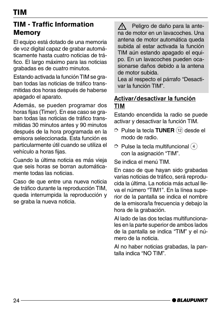 Memory El equipo está dotado de una memoria de voz digital capaz de grabar automáticamente hasta cuatro noticias de tráfico. El largo máximo para las noticias grabadas es de cuatro minutos. Estando activada la función TIM se graban todas las noticias de tráfico transmitidas dos horas después de haberse apagado el aparato. Además, se pueden programar dos horas fijas (Timer). En ese caso se graban todas las noticias de tráfico transmitidas 30 minutos antes y 90 minutos después de la hora programada en la emisora seleccionada. Esta función es particularmente útil cuando se utiliza el vehículo a horas fijas. Cuando la última noticia es más vieja que seis horas se borran automáticamente todas las noticias. Caso de que entre una nueva noticia de tráfico durante la reproducción TIM, queda interrumpida la reproducción y se graba la nueva noticia.