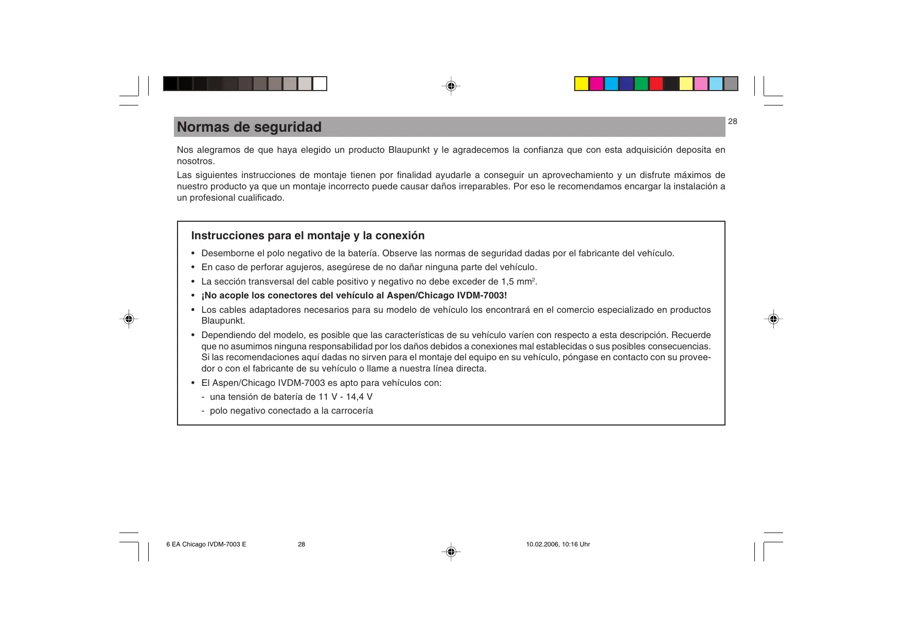 • Desemborne el polo negativo de la batería. Observe las normas de seguridad dadas por el fabricante del vehículo. • En caso de perforar agujeros, asegúrese de no dañar ninguna parte del vehículo. • La sección transversal del cable positivo y negativo no debe exceder de 1,5 mm2. • ¡No acople los conectores del vehículo al Aspen/Chicago IVDM-7003! • Los cables adaptadores necesarios para su modelo de vehículo los encontrará en el comercio especializado en productos Blaupunkt. • Dependiendo del modelo, es posible que las características de su vehículo varíen con respecto a esta descripción. Recuerde que no asumimos ninguna responsabilidad por los daños debidos a conexiones mal establecidas o sus posibles consecuencias. Si las recomendaciones aquí dadas no sirven para el montaje del equipo en su vehículo, póngase en contacto con su proveedor o con el fabricante de su vehículo o llame a nuestra línea directa. • El Aspen/Chicago IVDM-7003 es apto para vehículos con: - una tensión de batería de 11 V - 14,4 V - polo negativo conectado a la carrocería