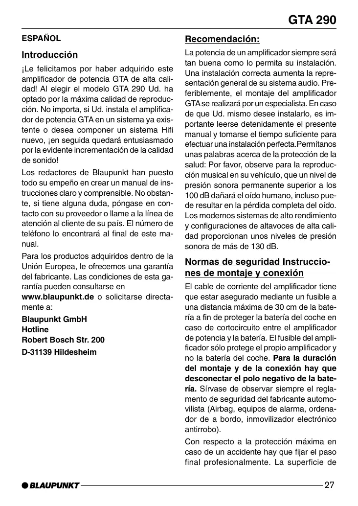 GTA 290 - Amplificador de audio BLAUPUNKT - Manual de uso y guía de instrucciones gratis