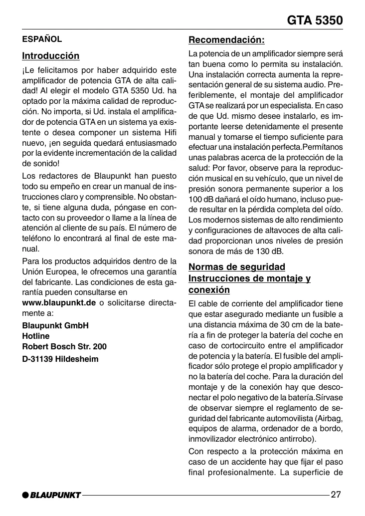 GTA 5350 - Amplificador de audio BLAUPUNKT - Manual de uso y guía de instrucciones gratis